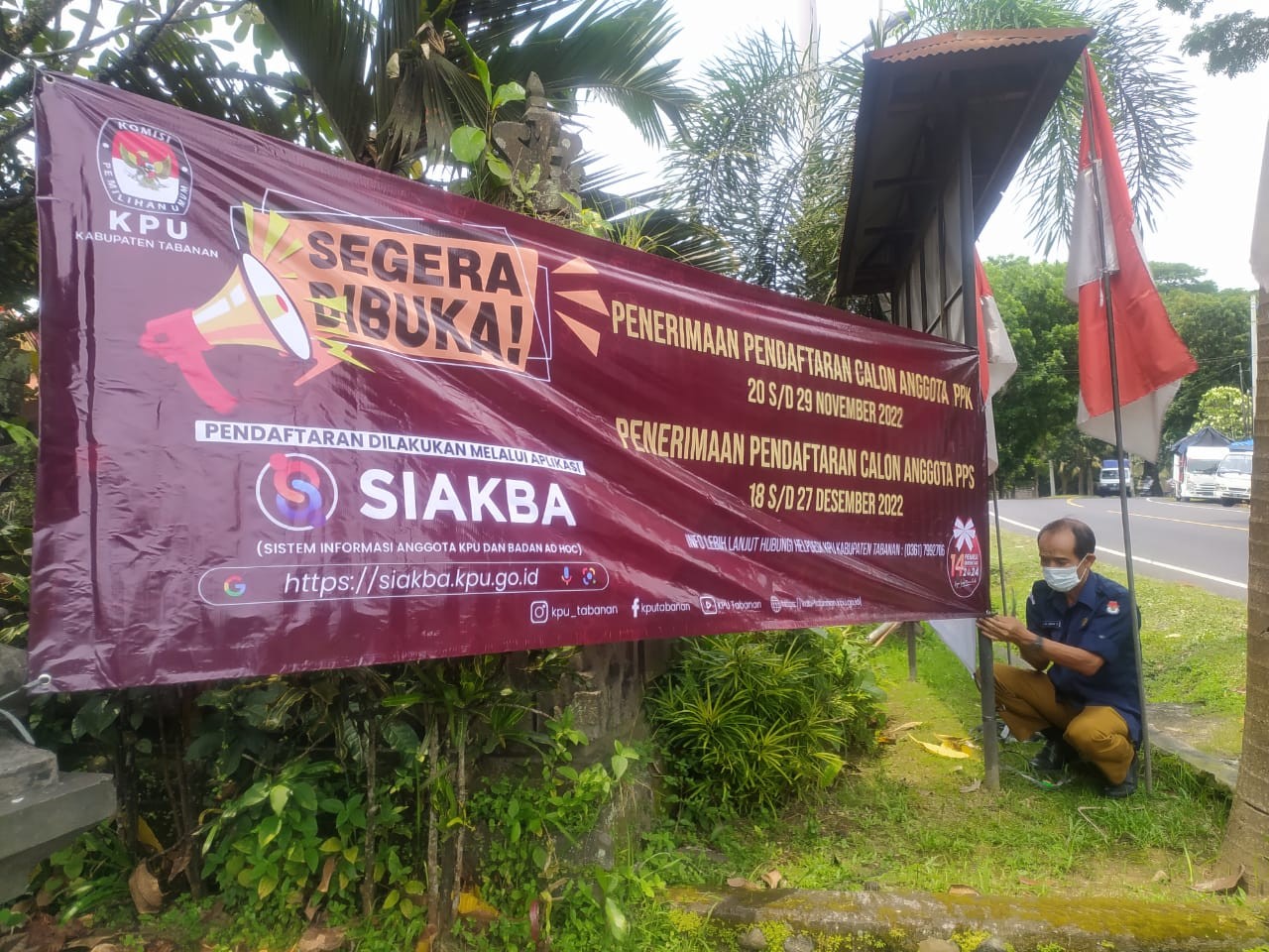 Dalam kesempatan itu KPU Tabanan juga membagikan selebaran kepada para Perbekel untuk ditempelkan di Kantor Perbekel yang berisikan ajakan kepada Masyarakat untuk ikut mendaftar sebagai Calon Anggota PPK dan PPS melalui aplikasi Sistem Informasi Anggota KPU dan Badan Ad Hoc (SIAKBA). Selain itu di setiap Kantor Camat dipasang dua spanduk terkait penerimaan pendaftaran Calon Anggota PPK dan PPS dalam rangka Pemilu Serentak 2024, spanduk tersebut dipasang di depan Kantor Camat (di luar pagar Kantor) dan satunya lagi ditempatkan di dalam areal Kantor Camat. (Humas KPU Tabanan).