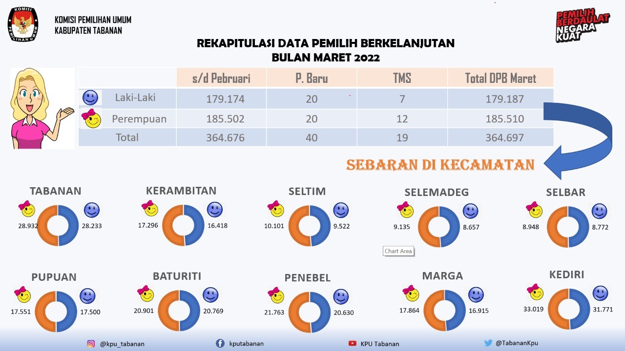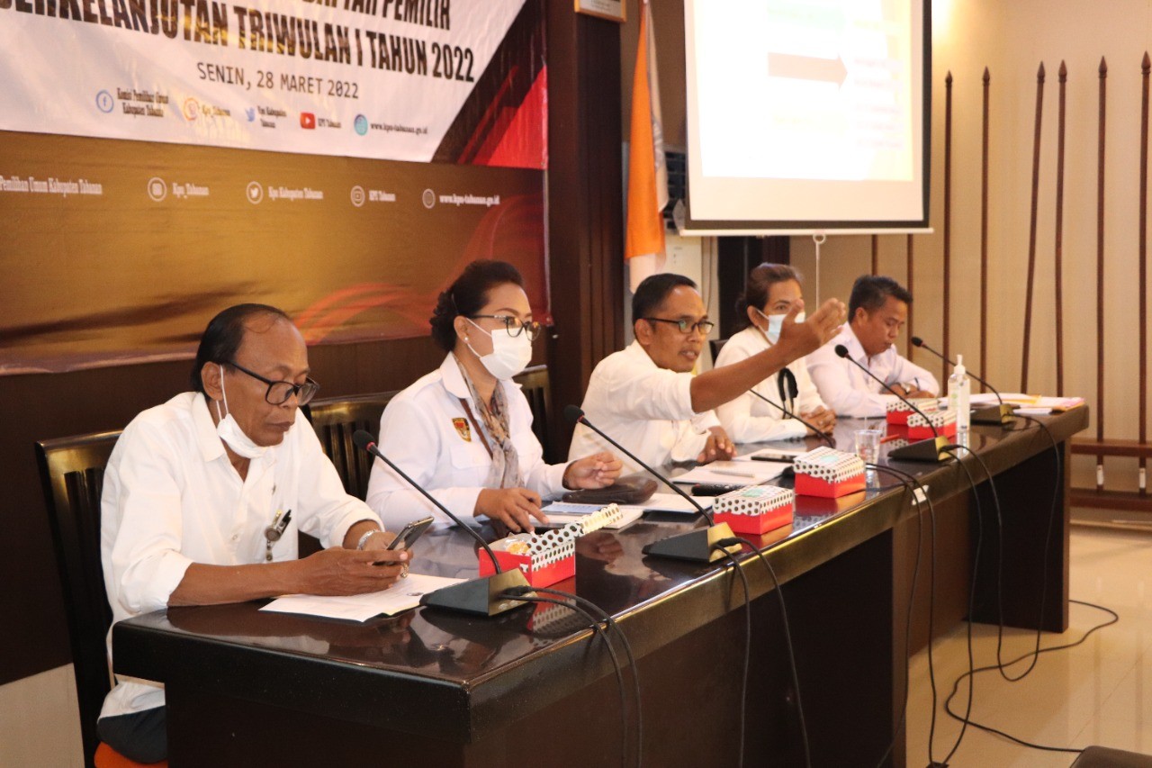 Pada intinya KPU Kabupaten Tabanan telah menetapkan jumlah Pemilih di Kabupaten Tabanan pada Maret 2022 sebanyak 364.697 Pemilih, yang terdiri dari Pemilih Laki-Laki sebanyak 179.187 dan Perempuan sebanyak 185.510 Pemilih. Jumlah tersebut bertambah sebanyak 21 Pemilih jika dibandingkan dengan jumlah Pemilih pada bulan Februari 2022 yang sebanyak 364.676 Pemilih.