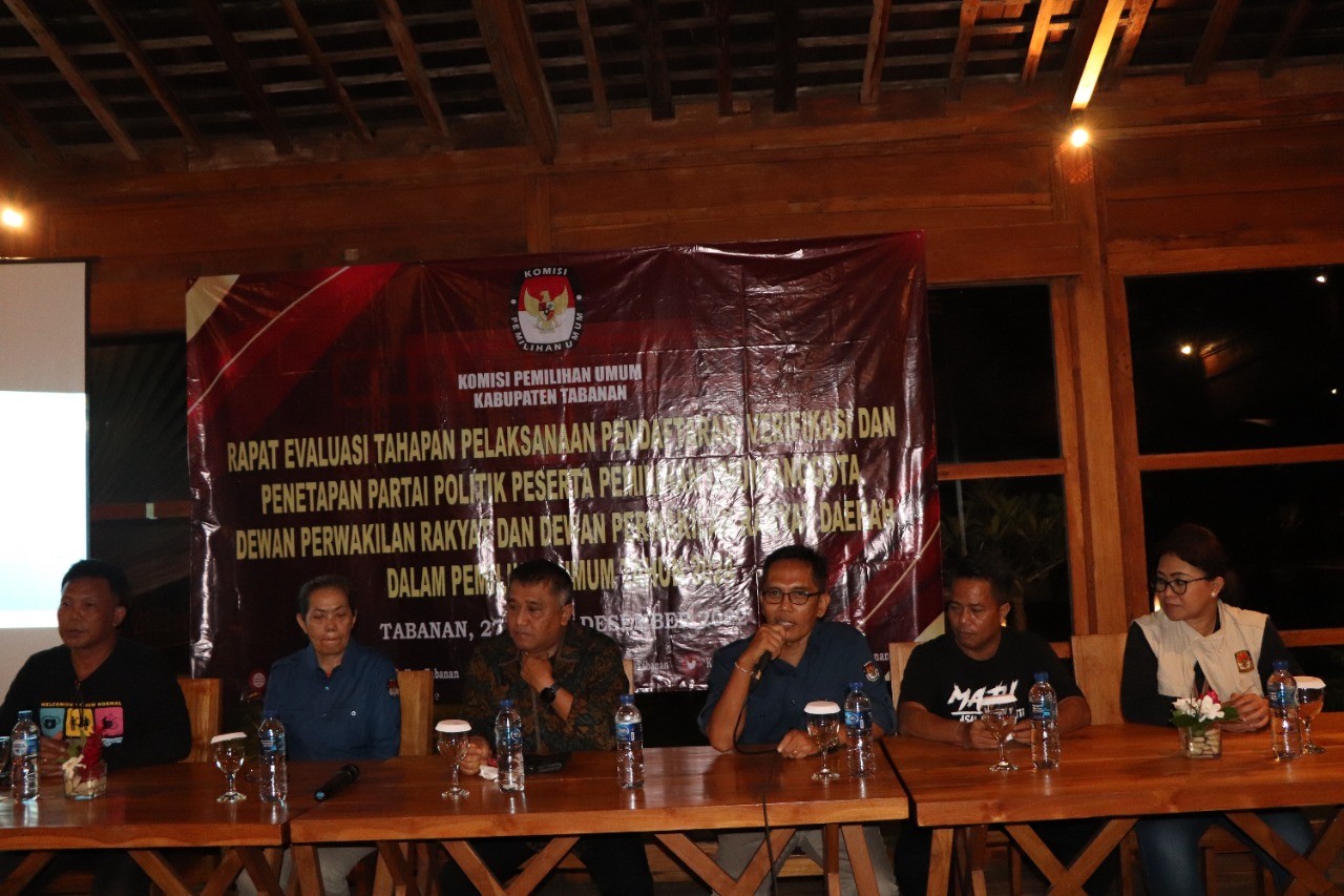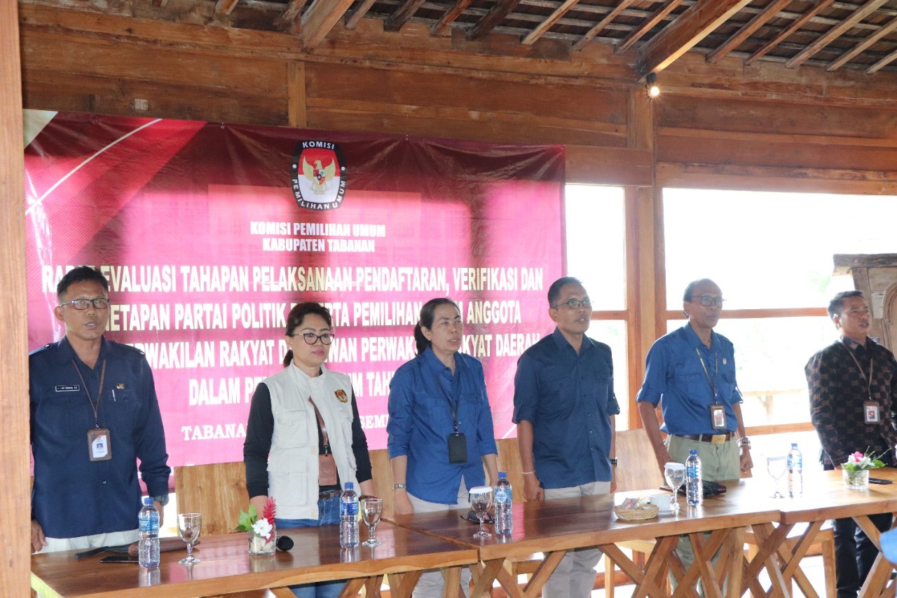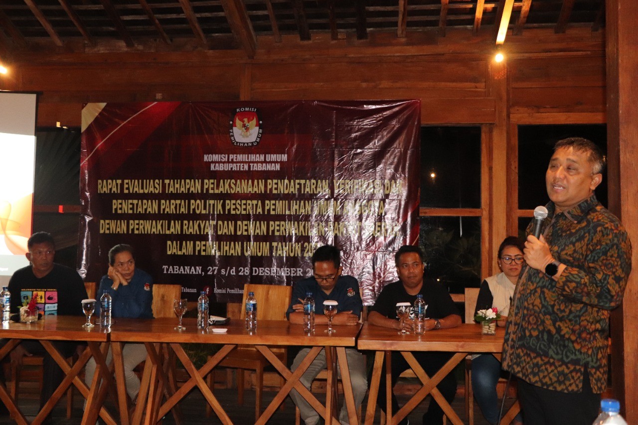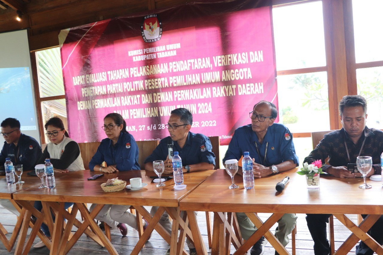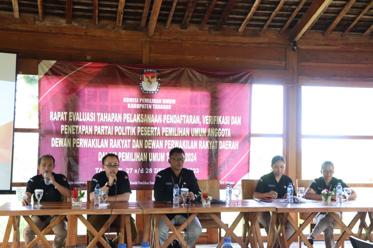 KPU Tabanan, Dangin Carik – Sehubungan dengan Pemilu Serentak 2024, KPU Kabupaten Tabanan gelar rapat evaluasi Tahapan pelaksanaan pendaftaran, verifikasi dan penetapan Parpol Peserta Pemilu Anggota DPR dan DPRD dalam Pemilu 2024, bertempat di Alami Boutique Villas & Resort, Desa Tangguntiti, Kecamatan Selemadeg Timur, Kabupaten Tabanan, Selasa – Rabu (27 s/d. 28) Desember 2022.