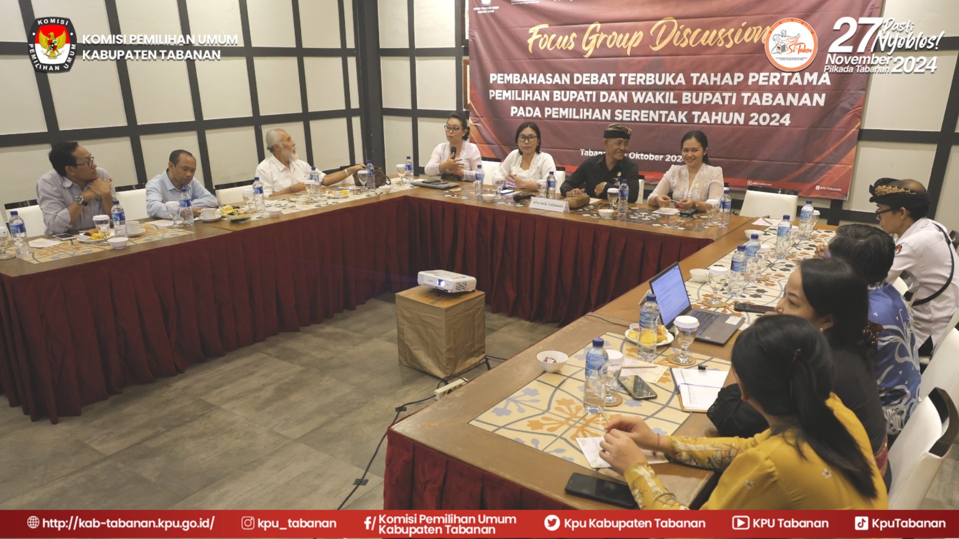 KPU Tabanan matangkan persiapan Debat Pertama Pasangan Calon Bupati dan Wakil Bupati Tabanan dengan mengundang tim perumus serta panelis pada Kamis 24 Oktober 2024 di Kurnia Village Beraban. Pembahasan tema serta teknis pembuatan soal yang pada nantinya pertanyaan pertanyaan yang dihasilkan mudah dipahami oleh masyarakat umum sehingga masyarakat dapat mudah mengikuti jalannya Debat nanti. Dirumuskan berdasarkan data di Kabupaten Tabanan maka Tema pada Debat pertama ini yakni " MEMPERKUAT PERTUMBUHAN EKONOMI YANG BERKELANJUTAN DAN INKLUSIF "