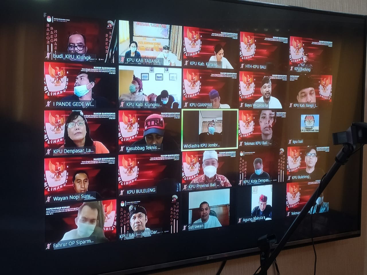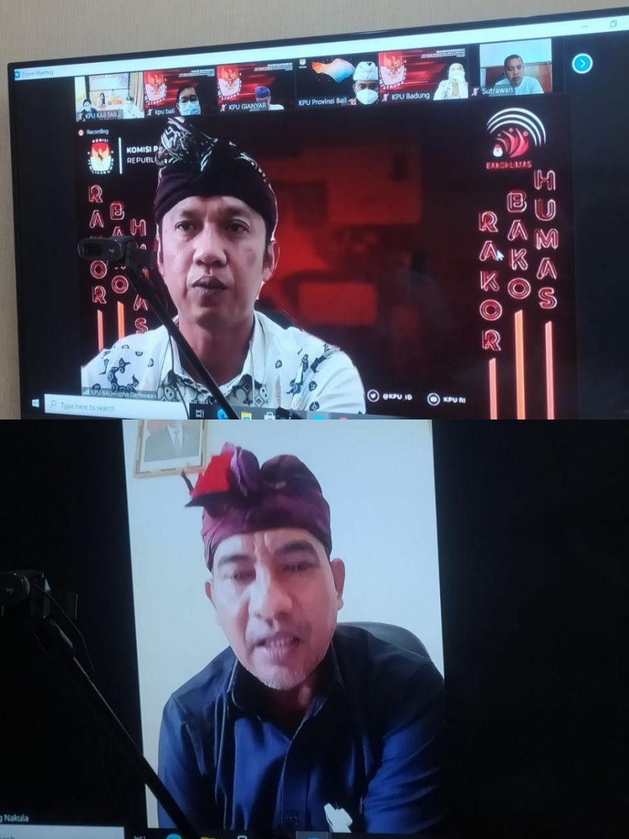Dalam zoom Meeting terlihat hadir Anggota KPU Bali Ketua Divisi Sosialisasi, Pendidikan Pemilih, Parmas dan SDM, I Gede John Darmawan dan Ketua Divisi Hukum dan Pengawasan, Anak Agung Gede Raka Nakula serta Pejabat lainnya dan Sub Bagian Tekmas Sekretariat KPU Bali, terlihat pula perwakilan dari KPU Kabupaten/Kota Se-Bali.