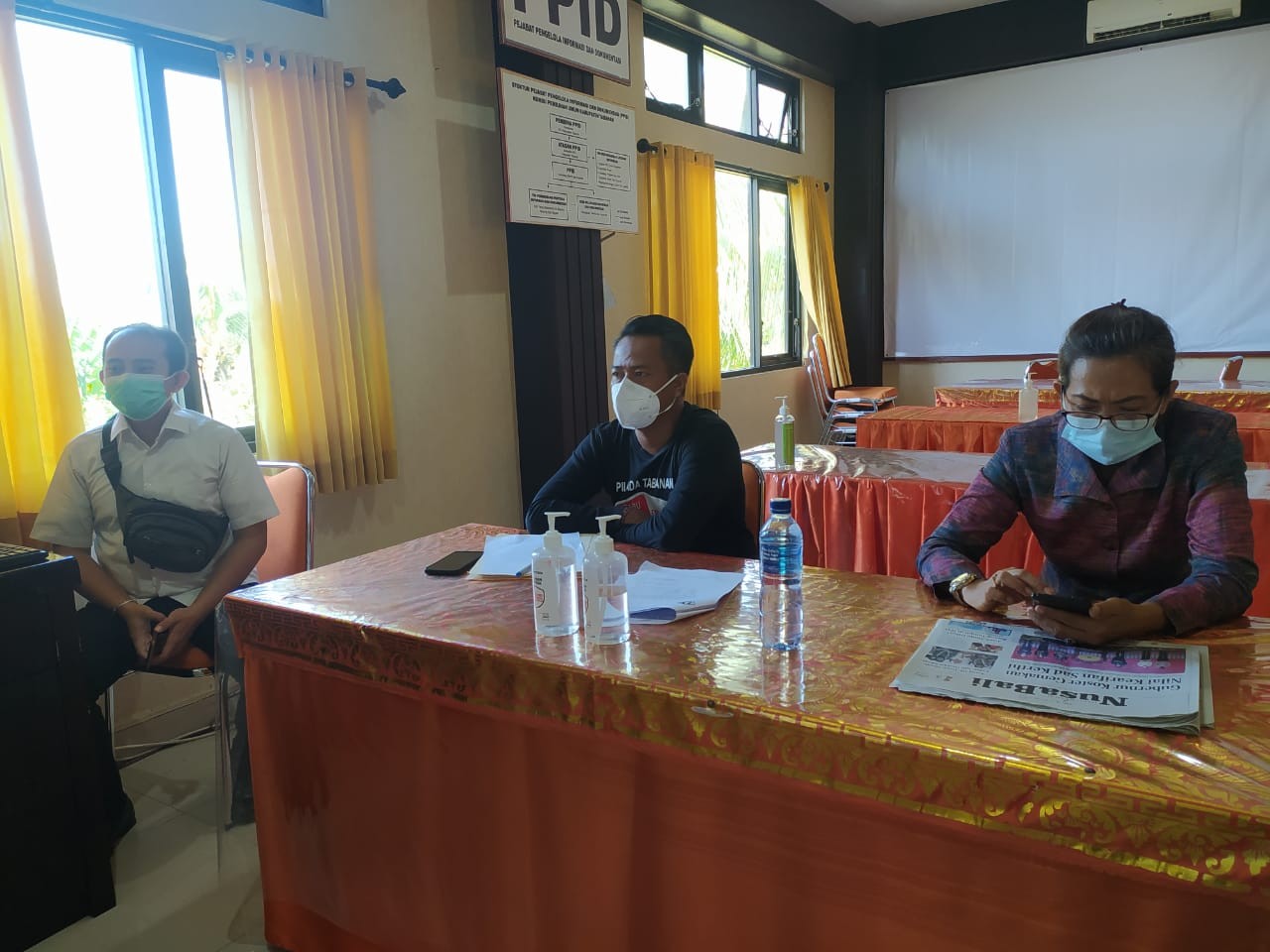 Kegiatan yang dilaksanakan dalam situasi Virus Corona atau Covid-19 dengan tetap memperhatikan protokol kesehatan seperti menjaga jarak fisik atau physical distancing, menggunakan masker, menggunakan cairan pembersih tangan atau hand zanitizer serta mencuci tangan dengan sabun dan air mengalir. (Humas KPU Tabanan).