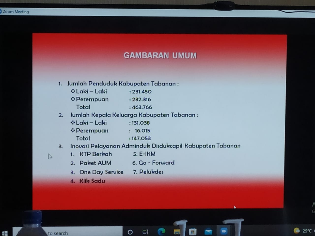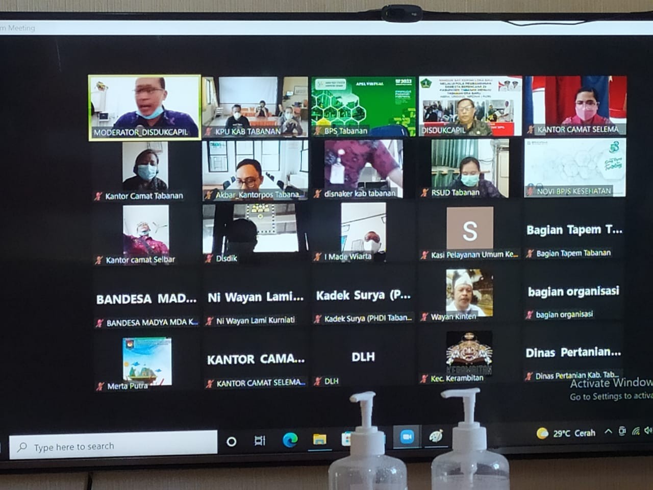 Diawali dengan menyanyikan lagu kebangsaan Indonesia Raya dan Doa bersama. Sebagai pemateri yakni Kepala Dinas Kependudukan dan Pencatatan Sipil Tabanan, I Gusti Agung Rai Dwipayana. Moderatornya adalah salah satu Pegawai di Disdukcapil Tabanan yaitu I Wayan Januada. Terlihat hadir dalam Zoom Meeting antara lain Bapelitbang, Bakeuda, Kesbangpol, Dinas PMD, Satpol PP, Dinas Kesehatan, BRSUD serta masih banyak lagi Instansi lainnya yang ada di Kabupaten Tabanan.