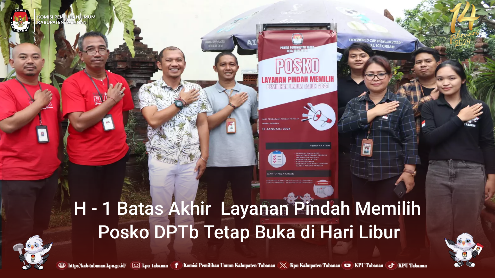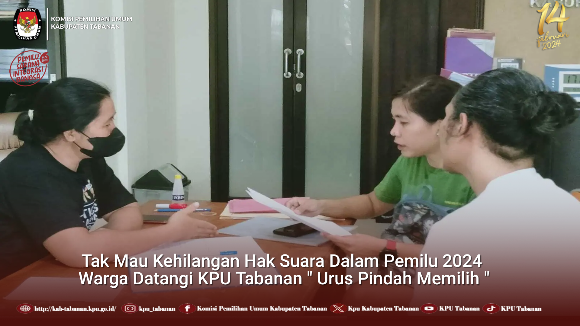 #TemanPemilih mendekati hari H Pemungutan Suara warga Tabanan kian banyak berdatangan ke KPU Tabanan untuk mengurus PINDAH MEMILIH yang akan dilayani hingga tanggal 15 JANUARI 2024. Kebanyakan warga yang datang dengan alasan : Pindah domisili, Tidak dapat memilih di TPS sesuai alamat domisili karena suatu hal misal sedang bekerja/bertugas ditempat berbeda. Sedang untuk mahasiswa yang pada hari pemungutan suara tidak memungkinkan untuk memilih di tempat asal juga banyak yang telah mengurus pindah memilih ini khususnya untuk wilayah Tabanan, yang telah mengurus pindah memilih ini yakni dari Taruna Politeknik Transportasi Darat Bali ( POLTRADA BALI ) dan International Training and Development Center ( BITDEC ), KPU juga memfasilitasi penghuni Rumah Tahanan ( LAPAS Kelas IIB Tabanan ) untuk mengurus pindah memilih penghuni Lapas tersebut agar bisa menggunakan Hak Pilihnya di TPS Khusus di lingkungan Lapas. Ketua Divisi Perencanaan Data dan Informasi KPU Tabanan, I Wayan Mudita merengkan bahwa KPU Tabanan akan melayani pindah memilih ini hingga tanggal 15 Januari 2024, warga yang hendak mengurus pindah memilih tersebut cukup membawa KTP dan KK atau Surat Keterangan Domisili dan Surat Tugas jika alasan tersebut karena alasan Tugas/Bekerja. “ Jangan lupa untuk memastikan bahwa nama anda telah terdaftar dalam Daftar Pemilih Tetap ( DPT ) yang telah ditetapkan oleh KPU. Bisa dengan mudah diakses melalui portal https://cekdptonline.kpu.go.id ,” tambah Mudita. #PemiluSerentak2024 #KPUMelayani #KPUTabanan