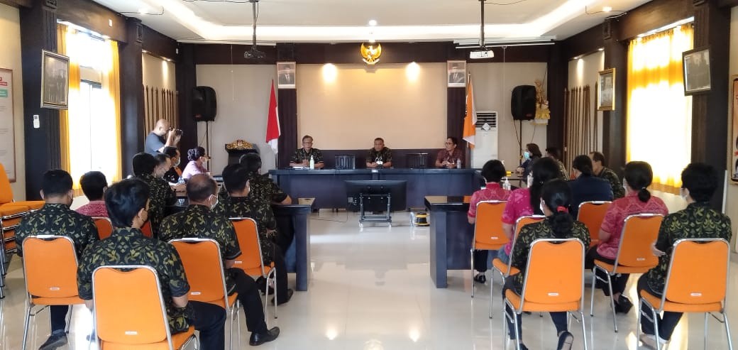 KPU Tabanan, Dangin Carik – Jajaran KPU Kabupaten Tabanan mendapatkan kesempatan bertemu langsung dengan Ketua KPU Provinsi Bali, I Dewa Agung Gede Lidartawan. Beliau didampingi oleh Kepala Bagian Teknis Penyelenggaraan Pemilu, Partisipasi dan Hubungan Masyarakat, Hukum dan SDM pada Sekretariat KPU Bali, I Wayan Nopi Suryanto, SH. Tujuannya adalah untuk mengetahui secara nyata terhadap situasi Kantor KPU Tabanan secara keseluruhan baik situasi Pegawai maupun lingkungan Kantor KPU Tabanan. Rombongan diterima Ketua KPU Tabanan, I Gede Putu Weda Subawa beserta Komisioner lainnya dan Sekretaris KPU Tabanan. Dalam acara pengarahan dari KPU Bali ini dihadiri pula oleh seluruh Jajaran Sekretariat KPU Tabanan yang dilangsungkan di Ruang Rapat Kantor KPU Tabanan, Selasa (18/01/2022). “Jagalah selalu integritas dan kepada Pegawai Pemerintah Non Pegawai Negeri (PPNPN) mudah mudahan nantinya akan menjadi Pegawai Pemerintah dengan Perjanjian Kerja (PPPK),” ungkap Lidartawan. Ditambahkannya supaya Sekretaris KPU Tabanan dapat lebih memberkan bimbingan kepada PPNPN yang ada sekarang. “Mari Kita belajar bareng-bareng karena itu akan lebih baik, kedepannya Saya inginkan kita lebih berkreatifitas,” imbuhnya. Sedangkan Nopi panggilan akrabnya mengungkapkan, “mohon Jajarannya diikutsertakam dalam pelatihan Pengadaan Barang/Jasa (PBJ. “KPU Tabanan merupakan salah satu sumber informasi maka dari itu tingkatkan kompetensi. Terkait publikasi pada Medsos KPU Tabanan sudah baik, mohon untuk dijaga bila perlu ditingkatkan.” Nopi juga mengharapkan arsip dapat dikelola dengan baik. “Kami sudah menandatangani Pakta Integritas beberapa minggu lalu saat upacara bendera,” ucap Weda sebagai laporannya kepada Ketua KPU Bali. I Nyoman Swandika yang merupakan Sekretaris KPU Tabanan mengatakan, “Terkait pembinaan, secara rutin setiap hari Kami adakan apel pagi dirangkai dengan pengarahan dan setiap hari Senin Kami rutin melaksanakan upacara bendera. Mengenai PBJ kami sudah ikutkan beberapa Orang untuk mengikuti Diklat. Terkait pengelolaan arsip Kami sudah lakukan, intinya Kami menyelamatkan arsip dan saat diperlukan akan mudah ditemukan.” Di ujung acara Lidartawan mengucapkan, “bekerjalah dengan baik, BEBERAPA Minggu kedepannya ini kita akan melaksanakan Vaksin ketiga.” Usai acara Ketua KPU Bali dan Kabag Teknis Penyelenggaraan Pemilu didampingi Komisioner dan Sekretaris KPU Tabanan melanjutkan kegiatannya dengan memasuki beberapa ruangan kerja yang ada di KPU Tabanan. Kegiatan yang dilaksanakan dalam situasi Virus Corona atau Covid-19, dengan tetap memperhatikan protokol kesehatan seperti menjaga jarak fisik atau physical distancing, menggunakan masker, menggunakan cairan pembersih tangan atau hand zanitizer serta mencuci tangan dengan sabun dan air mengalir. (Humas KPU Tabanan).
