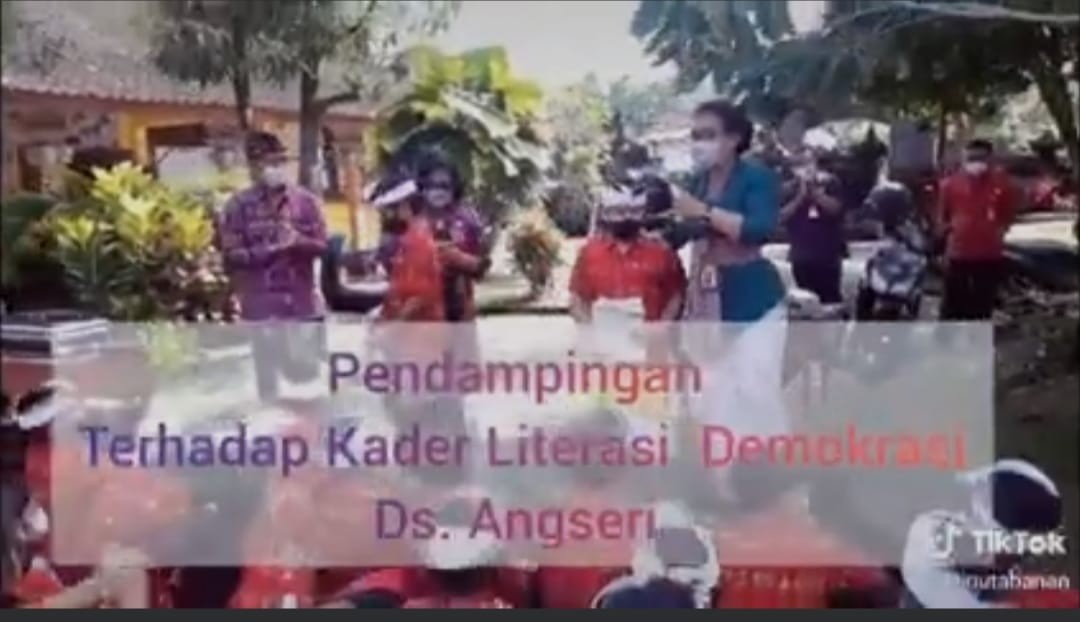 KPU Tabanan, Dangin Carik – Anggota Komisi Pemilihan Umum (KPU) Kabupaten Tabanan Ketua Divisi Sosialisasi, Pendidikan Pemilih, Parmas dan SDM, Ni Putu Suaryani mendatangi Desa Angseri, Kecamatan Baturiti, tepatnya di halaman Sekolah Dasar Nomor 3 Angseri untuk menemui Kader Demokrasi, Kamis (13/01/2022). Kedatangan Komisioner KPU Tabanan itu memenuhi surat dari Perbekel Desa Angseri Nomor 005/782/I/2022 tanggal 10 Januari 2022 dalam rangka pengundian rangkuman literasi demokrasi (Kader Demokrasi) yang sudah terlaksana selama ini melalui Kader Demokrasi Desa Angseri. Sesuai undangan Perbekel Desa Angseri, I Nyoman Warnata, hadir pula dari Dinas Perpustakaan dan Kearsipan Kabupaten Tabanan, perwakilan Sekolah Se-Desa Angseri dan dari Redaksi Kompas Media. Dalam kesempatan itu KPU Tabanan bersama Instansi terkait mendampingi Kader Demokrasi memberikan pendidikan demokrasi kepada Anak-Anak usia dini. Selain itu tujuan KPU Tabanan ke Desa Angseri untuk melakukan pembinaan kepada Kader demokrasi yang sudah dibentuk di Desa Angseri dengan membuat konten kreatif yang diunggah di media sosial menyasar seluruh segmen yang ada di Desa Angseri. Kegiatan yang dilaksanakan dalam situasi Virus Corona atau Covid-19, dengan tetap memperhatikan protokol kesehatan seperti menjaga jarak fisik atau physical distancing, menggunakan masker, menggunakan cairan pembersih tangan atau hand zanitizer serta mencuci tangan dengan sabun dan air mengalir.