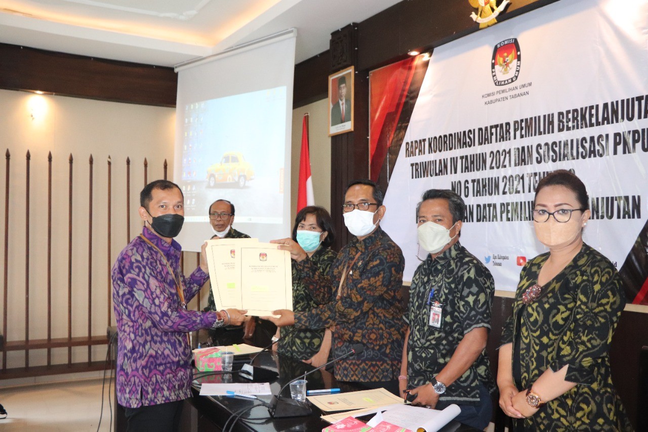 Dalam rangka pemutakhiran data Pemilih berkelanjutan tahun 2021 maka Komisi Pemilihan Umum (KPU) Kabupaten Tabanan menyelenggarakan Rapat koordinasi (Rakor) daftar Pemilih berkelanjutan triwulan IV tahun 2021 dan sosialisasi Peraturan Komisi Pemilihan Umum (PKPU) Nomor 6 tahun 2021 tentang pemutakhiran data Pemilih berkelanjutan sesuai surat undangan KPU Tabanan Nomor 1149/PP.07/5102/2021 tanggal 9 Desember 2021. Yang hadir dalam kegiatan yakni Ketua KPU Tabanan, I Gede Putu Weda Subawa serta seluruh Anggota KPU Tabanan dan Sekretaris KPU Tabanan. Hadir pula para undangan seperti Kodim 1619 Tabanan, Polres Tabanan, Dinas Kependudukan dan Pencatatan Sipil Kabupaten Tabanan, Dinas Pemberdayaan Masyarakat Desa Kabupaten Tabanan, Anggota Bawaslu Tabanan, I Ketut Narta serta Pimpinan atau Pengurus Partai Politik (Parpol) yang ada di Kabupaten Tabanan. Selain itu hadir Anggota KPU Provinsi Bali, I Gede John Darmawan, pukul 09.30 Wita, bertempat di ruang rapat Kantor KPU Tabanan, Selasa (14/12/2021). Kegiatan dibuka Ketua KPU Tabanan, “pemutakhiran daftar Pemilih berkelanjutan ini akan terus berlangsung sampai Pemilu dan Pemilihan tahun 2024 dan akan Kami lanjutkan dengan sosialisasi PKPU Nomor 6 tahun 2021 tentang pemutakhiran data Pemilih berkelanjutan,” ungkap Pak Weda. Sedangkan I Ketut Sugina yang merupakan Anggota KPU Tabanan Ketua Divisi Perencanaan, Data dan Informasi mengungkapkan, “Pertemuan ini merupakan kegiatan rutin Kita yaitu Rakor setiap tiga bulan sekali terkait daftar Pemilih berkelanjutan sesuai amanat PKPU. Dijelaskan juga dalam PKPU mengenai keikutsertaan Lembaga terkait, bersifat responsif dan terbuka.” Selanjutnya Sugina menyampaikan materinya. Dibandingkan dengan Daftar Pemilih Tetap (DPT) tahun 2020 lalu, jumlah Pemilih di Kabupaten Tabanan tahun ini bertambah sebanyak 2.068 Pemilih. Kalau DPT Pilkada 9 Desember 2020 lalu Sejumlah 362.813 maka jumlah Pemilih per Desember tahun 2021 sebanyak 364.881 Pemilih, terdiri dari Pemilih Laki-Laki sebanyak 179.286 Pemilih dan Pemilih Perempuan sebanyak 185.595 Pemilih. Dalam paparannya Ketua Divisi Perencanaan, Data dan Informasi KPU Tabanan, I Ketut Sugina mengatakan bahwa Pemutakhiran Data Pemilih Berkelanjutan (PDPB) bulan Desember ini telah selesai direkap dan dikoordinasikan dengan para Pemangku Kepentingan atau Stakeholder. Dalam proses bulan Desember ini terdapat jumlah Pemilih baru sebanyak 715 Pemilih, terdapat pula Pemilih yang Tidak Memenuhi Syarat (TMS) sebanyak 976 Pemilih dan yang ubah data sebanyak 5.663 Pemilih. Jika dibandingkan dengan PDPB bulan November sebanyak 365.142 Pemilih maka ada penurunan Pemilih sebanyak 261 Pemilih sehingga pemilih Tabanan di bulan Desember mencapai 364.881 Pemilih. “Hasil rekap Kita bulan Desember ini, jumlah Pemilih di Tabanan mencapai 364.881 Pemilih yang tersebar di 10 Kecamatan dan133 Desa di Kabupaten Tabanan,” ucapnya. Dari jumlah tersebut kata dia terbanyak ada di Kecamatan Kediri sebanyak 64.948 Pemilih, menyusul kecamatan Tabanan 57.174 Pemilih dan seterusnya, sementara jumlah Pemilih terkecil ada di kecamatan Selemadeg Barat, hanya 17.720 Pemilih. Dijelaskan Sugina, kalau dibandingkan dengan jumlah Pemilih pada Daftar Pemilih Tetap (DPT) saat Pilkada 9 Desember 2020 lalu yang DPTnya berjumlah 362.813, maka pada Desember 2021 ini ada peningkatan sebanyak 2.068 Pemilih. “Kalau Kita bandingkan dengan DPT terakhir, maka DPB Kita akhir tahun ini meningkat sebanyak 2.068 Pemilih,” tegasnya. Sementara Ketua KPU Tabanan, I Gede Putu Weda Subawa dalam rapat koordinasi tersebut menegaskan apa yang dilakukan KPU Tabanan dalam pemutakhiran data Pemilih berkelanjutan menunjukkan upaya serius dari KPU dalam upaya menyajikan data Pemilih menjelang Pemilu dan Pemilihan Serentak 2024 yang berkualitas dengan prinsip Komprehensif, Inklusif, Akurat, Mutakhir, Terbuka, Responsif, Partisipatif, Akuntabel dan Perlindungan Data pribadi. “Sesuai dengan PKPU 6 tahun 2021, pemutakhiran data Pemilih berkelanjutan yang dilakukan KPU Tabanan telah memenuhi prinsip-prinsip tersebut, kedepannya Kami berharap kerjasama semua pihak sehingga data Pemilih Kita hasilnya benar-benar berkualitas,” ucapnya. Selanjutnya Rekapitulasi dan Berita Acara Rapat koordinasi diserahkan kepada KPU RI melalui KPU Provinsi Bali yang diwakli I Gede John Darmawan dan Bawaslu Tabanan diwakili I Ketut Narta. Sedangkan Komisioner KPU Bali, I Gede John Darmawan dalam pengarahannya menegaskan KPU Tabanan telah bekerja maksimal dalam upaya memutakhirkan data Pemilih di Kabupaten Tabanan. Hal itu tentunya dengan dukungan penuh dari Pimpinan Parpol dan para Stakeholder yang ada. Pihaknya menegaskan KPU secara keseluruhan terus bekerja dan berupaya melakukan tugas-tugasnya, salah satunya memutakhirkan data Pemilih berkelanjutan. "Namun perlu diingat KPU melakukan pemutakhiran data Pemilih dan bukan data Penduduk, karena memang itu tugas KPU, sementara data penduduk itu menjadi domain Disdukcapil," ucapnya. Untuk itu pihaknya berharap dalam proses-proses ini, semua pihak ikut memberikan masukan dan juga mengawasi proses ini sehingga kedepannya dihasilkan data Pemilih yang benar-benar berkualitas. "Data Pemilih yang dihasilkan KPU nantinya adalah data Pemilih hasil kerja Kita bersama, sehingga sudah sewajarnya kita ikut ambil peran di dalamnya," harap John Darmawan. Selanjutnya hasil pemutakhiran data pemilih berkelanjutan bulan Desember 2021 tersebut ditempelkan pada papan pengumuman KPU Tabanan dan diunggah pula pada media online KPU Tabanan. Kegiatan yang dilaksanakan pada masa Virus Corona atau Covid-19 dengan tetap memperhatikan protokol kesehatan seperti menjaga jarak fisik atau physical distancing, menggunakan masker, menggunakan cairan pembersih tangan atau hand zanitizer serta mencuci tangan dengan sabun dan air mengalir. (Humas KPU Tabanan)