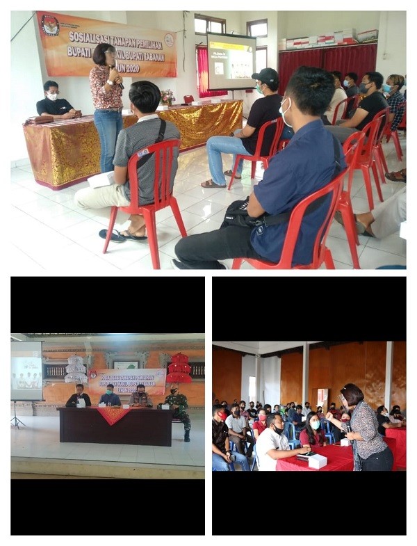 KPU Tabanan, Dangin Carik – Dalam rangka Pemilihan Serentak yang akan digelar di seluruh Indonesia pada hari Rabu tanggal 9 Desember 2020, Komisi Pemilihan Umum (KPU) Tabanan melaksanakan Tahapan Pemilihan Bupati dan Wakil Bupati Tabanan 2020 berupa sosialisasi Peraturan Komisi Pemilihan Umum Nomor 15 Tahun 2019 tentang Tahapan, Program dan Jadwal Penyelenggaraan Pemilihan Gubernur dan Wakil Gubernur, Bupati dan Wakil Bupati, dan/atau Wali Kota dan Wakil Wali Kota Tahun 2020 sebagaimana telah beberapa kali diubah, terakhir dengan Peraturan Komisi Pemilihan Umum Nomor 5 Tahun 2020 tentang Perubahan Ketiga Atas Peraturan Komisi Pemilihan Umum Nomor 15 Tahun 2019 tentang Tahapan, Program dan Jadwal Penyelenggaraan Pemilihan Gubernur dan Wakil Gubernur, Bupati dan Wakil Bupati, dan/atau Wali Kota dan Wakil Wali Kota Tahun 2020. Komisioner KPU Tabanan, Ketua Divisi Teknis Penyelenggaraan, Luh Made Sunadi, sebagai Narasumber dalam sosialisasi Peraturan KPU Nomor 5 Tahun 2020 terhadap Karang Taruna Se-Kecamatan Selemadeg. Sedangkan Komisioner KPU Tabanan, Ketua Divisi Perencanaan, Data dan Informasi, I Ketut Sugina, menyampaikan materi sosialisasi kepada Karang Taruna Se-Kecamatan Kerambitan. Di tempat lain, Ni Putu Suaryani yang merupakan Komisioner KPU Tabanan, Ketua Divisi Sosialisasi dan SDM, sebagai Narasumber di Kecamatan Kediri. Masing-masing Komisioner didampingi Pegawai Sekretariat KPU Tabanan. Acara dimulai Pukul 10.00 Wita bertempat di masing-masing Kecamatan, Jumat, (21/08/2020). “Saya berharap Karang Taruna dapat menjadi penggerak sosialisasi Pilkada di tengah Pandemi Covid-19,” ungkap I Ketut Sugina, dihubungi melalui pesan WhatsApp. Komisioner KPU Tabanan, Luh Made Sunadi saat dihubungi melalui telepon mengatakan, “harapan Kami agar semua elemen Masyarakat khususnya Karang Taruna sebagai calon pemimpin Bangsa, mengetahui serta memahami Tahapan Pemilihan Bupati dan Wakil Bupati Tabanan Tahun 2020, sehingga para kaum milenial ini akan mampu membangkitkan semangat berdemokrasi yang pada akhirnya dapat meningkatkan partisipasi Pemilih.” Hal senada disampaikan pula Komisioner KPU Tabanan, Ni Putu Suaryani. Di masing-masing Kecamatan, tampak Panitia Pemilihan Kecamatan (PPK) memfasilitasi acara sosialisasi, setelah sebelumnya berkoordinasi dengan Camat dan dihadiri pula dari pihak Kecamatan, Aparat TNI dan Polri. Selain itu terlihat Pengawas Kecamatan (Panwascam) melakukan pengawasan. Kegiatan yang dilaksanakan dalam situasi pandemi Covid-19 atau Virus Corona, dengan tetap memperhatikan Protokol Kesehatan seperti physical distancing atau menjaga jarak fisik, menggunakan masker serta menggunakan hand zanitizer atau cairan pembersih tangan.