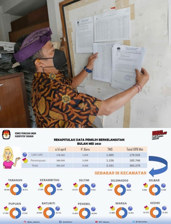 Ketua Divisi Perencanaan, Data dan Informasi KPU Tabanan, I Ketut Sugina seijin Ketua KPU Tabanan, I Gede Putu Weda Subawa, disela-sela penempelan rekapitulasi data Pemilih pada papan Pengumuman KPU Tabanan mengatakan, “sesuai Undang-Undang Pemilu Nomor 7 tahun 2017, Peraturan KPU (PKPU) Nomor 2 tahun 2017, PKPU Nomor 11 tahun 2018 serta Surat Dinas KPU RI Nomor 132 dan 366 tahun 202, maka KPU berkewajiban melakukan pemutakhiran dan memelihara data Pemilih secara berkelanjutan dengan memperhatikan data kependudukan sesuai dengan perundang-undangan.