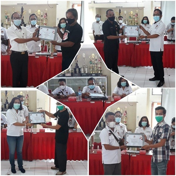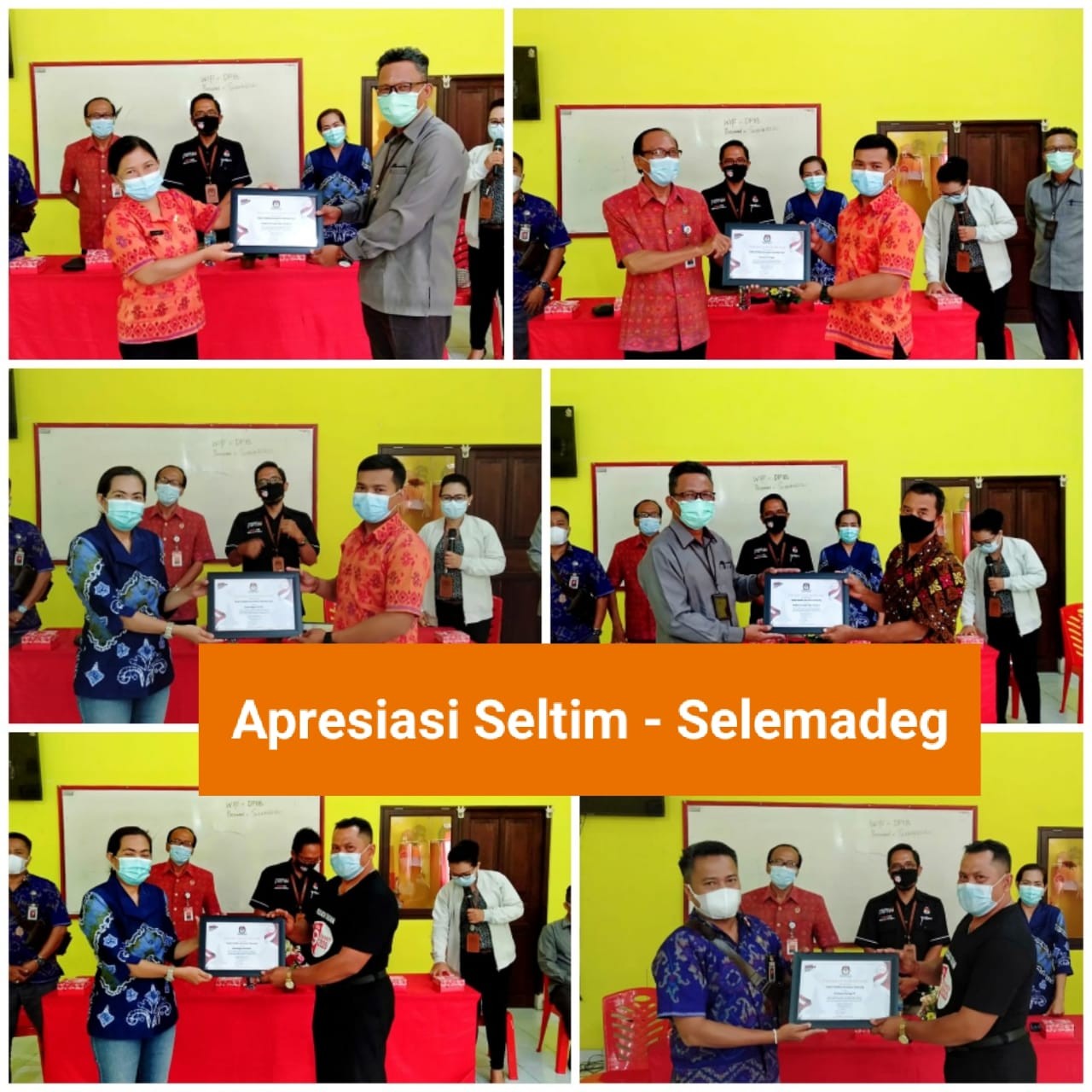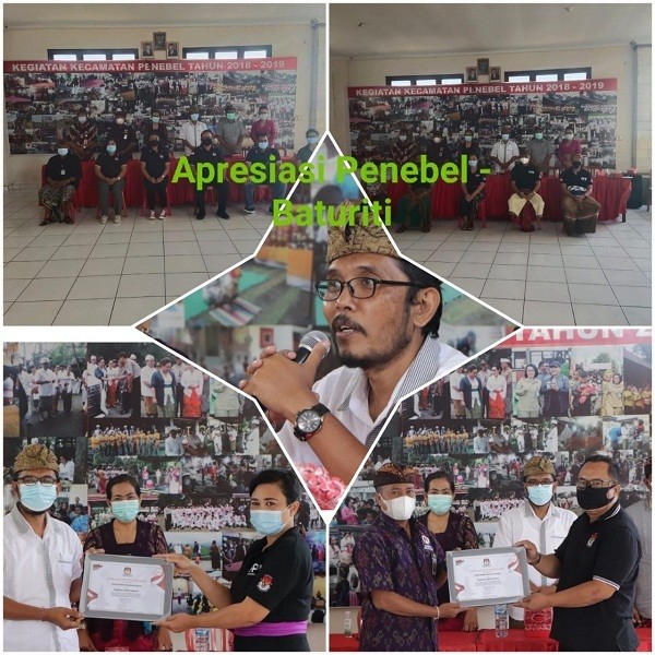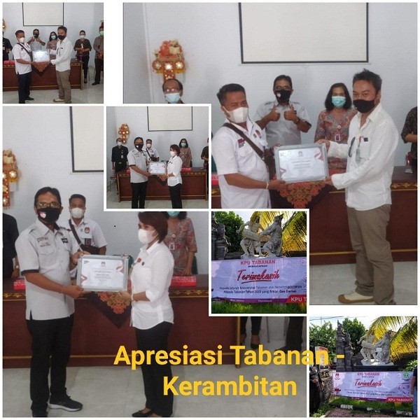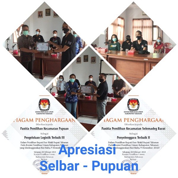 KPU Tabanan, Dangin Carik – Dalam rangka menyampaikan ucapan terima kasih kepada Panitia Pemilihan Kecamatan (PPK) Se-Kabupaten Tabanan, beberapa hari lalu tepatnya sejak tanggal 15 Februari 2021, Komisi Pemilihan Umum (KPU) Kabupaten Tabanan telah mendatangi 8 PPK dari 10 PPK yang ada di Kabupaten Tabanan antara lain, PPK Kediri, Marga, Selemadeg Timur, Selemadeg, Tabanan, Kerambitan, Baturiti dan kemarin PPK Penebel dalam rangka menyampaikan Apresiasi terkait pelaksanaan Pemilihan Bupati dan Wakil Bupati Tabanan dalam Pemilihan Serentak Lanjutan tahun 2020 yang telah digelar pada hari Rabu tanggal 9 Desember 2020. Berkaitan dengan itu, Jumat (19 Feb 2021), bertempat di Ruang Rapat Kantor Camat Selemadeg Barat, Komisioner KPU Tabanan diantaranya Anggota KPU Tabanan Ketua Divisi Teknis Penyelenggaraan, Luh Made Sunadi, Ketua Divisi Hukum dan Pengawasan, I Wayan Sutama, Ketua Divisi Perencanaan, Data dan Informasi, I Ketut Sugina serta Ketua Divisi Sosialisasi, Pendidikan Pemilih, Parmas dan SDM, Ni Putu Suaryani menyampaikan Apresiasi kepada Ketua, Anggota serta Sekretariat PPK Selemadeg Barat (Selbar) dan PPK Pupuan. Hadir pula Sekretaris KPU Tabanan, I Nyoman Swandika dan beberapa Staf Sekretariat KPU Tabanan. Sedangkan Ketua KPU Kabupaten Tabanan tidak dapat hadir karena beliau sedang mengikuti Rapat Koordinasi terkait Logistik di Kantor KPU Provinsi Bali. Dari pihak PPK Selemadeg Barat dan Pupuan yang hadir adalah Ketua, Anggota beserta Kesekretariatan PPK. Acara yang dimulai Pukul 10.00 Wita merupakan hari terakhir penyampaian Apresiasi kepada Badan Ad –Hoc di tingkat Kecamatan. Dalam kesempatan itu, Komisioner KPU Tabanan menyerahkan Piagam Penghargaan kepada Ketua PPK Selemadeg Barat yakni I Wayan Yasa karena PPK Selemadeg Barat berhasil mendapatkan Juara 2 Kategori Penyelenggara Terbaik, sedangkan PPK Pupuan diwakili oleh Ketuanya, I Putu Wedha Saputra, menerima Piagam Penghargaan sebagai Juara 3 Kategori Pengelolaan Logistik. KPU Tabanan juga menyerahkan Spanduk kepada masing-masing PPK yang berisikan ucapan terima kasih kepada seluruh Masyarakat Tabanan atas terselenggaranya Pilkada Tabanan tahun 2020 secara Aman dan Damai. Dihubungi melalui sambungan telepon mengenai tanggapannya, I Wayan Yasa mengatakan “Adanya Apresiasi dari KPU Tabanan kepada PPK merupakan hal yang bagus serta perlu dilanjutkan. Saya sangat senang dan bangga menjadi bagian dari Penyelenggara Pemilihan Serentak 2020.” Begitu juga dengan perasaan I Putu Wedha Saputra, dikatakannya “Kami mewakili teman-teman PPK merasa sangat senang, awalnya agak kecewa karena Kami kira tidak akan ada perpisahan ataupun salam tapi ternyata ada dan Kami apresiasi hal tersebut.” Kegiatan yang dilaksanakan dalam situasi pandemi Covid-19 atau Virus Corona, dengan tetap memperhatikan Protokol Kesehatan seperti physical distancing atau menjaga jarak fisik, menggunakan masker, pengecekan suhu/temperatur tubuh dengan thermogun, menggunakan hand zanitizer atau cairan pembersih tangan serta mencuci tangan dengan sabun dan air mengalir.