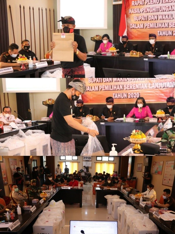 KPU Tabanan, Dangin Carik – Berdasarkan Surat Undangan Ketua KPU Kabupaten Tabanan, Nomor 2377/PL.02.6-Und/5102/KPU-kab/XII/2020, tanggal 13 Desember 2020. Rabu, (16/12/2020), pukul 10.00 Wita, bertempat di Ruang Rapat Kantor KPU Tabanan, diselenggarakan Rapat Pleno Terbuka Rekapitulasi Hasil Penghitungan Suara Pemilihan Bupati dan Wakil Bupati Tabanan dalam Pemilihan Serentak Lanjutan tahun 2020. Hadir dalam acara yakni Ketua dan Anggota KPU Tabanan, Sekretaris KPU Tabanan, Komisioner KPU Provinsi Bali, Anak Agung Gede Raka Nakula sekaligus sebagai Korwil Tabanan dalam Pemilihan Serentak Lanjutan 2020, Perwakilan Pemkab Tabanan, pihak DPRD Tabanan, Kapolres Tabanan dan Dandim 1619 Tabanan. Selain itu hadir pihak Pengadilan Negeri Tabanan, Kejaksaan Negeri Tabanan, Kesbangpol Tabanan, Ketua dan Anggota Bawaslu Kabupaten Tabanan serta Saksi Pasangan Calon Bupati dan Wakil Bupati Tabanan Nomor Urut 1 ((Dr. I Komang Gede Sanjaya,SE.,MM. – I Made Edi Wirawan,SE.) dan Saksi Pasangan Calon Bupati dan Wakil Bupati Tabanan Nomor Urut 2 (Anak Agung Ngurah Panji Astika, S.T. – I Dewa Nyoman Budiasa) dengan membawa Surat Mandat Saksi. Hadir pula Ketua dan satu Orang Anggota PPK Se-Kabupaten Tabanan serta Pewarta Kabupaten Tabanan. Kegiatan ini juga disiarkan langsung atau live streaming melalui akun resmi KPU Tabanan yaitu Facebook. Rapat Pleno dibuka Ketua KPU Tabanan, I Gede Putu Weda Subawa, dilanjutkan dari masing-masing Anggota KPU Tabanan. Kemudian Pembacaan Rekapitulasi Hasil Penghitungan Suara di tingkat Kecamatan oleh masing- masing PPK Se-Kabupaten Tabanan. Di bawah ini disampaikan kutipan Keputusan KPU Kabupaten Tabanan, Nomor 2397/PL.02.6-Kpt/5102/KPU-Kab/XII/2020 tentang Penetapan Rekapitulasi Hasil Penghitungan Suara Pemilihan Bupati dan Wakil Bupati Tabanan tahun 2020, tertanggal 16 Desember 2020 yakni Pasangan Calon Bupati dan Wakil Bupati Tabanan 2020 Nomor Urut 1 ((Dr. I Komang Gede Sanjaya,SE.,MM. – I Made Edi Wirawan,SE.) dengan Perolehan Suara sebanyak 207.276 (Dua ratus tujuh ribu dua ratus tujuh puluh enam) Suara sedangkan Pasangan Calon Bupati dan Wakil Bupati Tabanan 2020 Nomor Urut 2 (Anak Agung Ngurah Panji Astika, S.T. – I Dewa Nyoman Budiasa) dengan Perolehan Suara sebanyak 77.141 (Tujuh puluh tujuh ribu seratus empat puluh satu) Suara. KPU Tabanan juga telah menempelkan Berita Acara dan Sertifikat Rekapitulasi Hasil Penghitungan Suara di tingkat Kabupaten Pemilihan Bupati dan Wakil Bupati Tabanan tahun 2020 pada Papan Pengumuman Kantor KPU Tabanan serta diunggah pada website KPU Tabanan. Untuk lebih jelasnya klik www.kpu-tabanankab.go.id silahkan dilihat dan didownload pada kolom Pengumuman. Untuk diketahui, dalam kegiatan ini terlihat dari pihak KPU Kabupaten Gianyar dan KPU Kabupaten Buleleng sedang melaksanakan Studi Komparasi atau Studi Tiru. “Kami ke KPU Tabanan dengan tujuan untuk melaksanakan Studi Komparasi karena dalam Pilkada Serentak Lanjutan 2020 ini, Kami tidak ikut melaksanakannya,” ucap Komisioner KPU Gianyar, ketika dimintai keterangan. Sebagai informasi, kemarin pada hari Selasa, tanggal 15 Desember 2020, KPU Tabanan telah melaksanakan Rakor Persiapan Rekapitulasi Hasil Penghitungan Suara Pemilihan Bupati dan Wakil Bupati Tabanan 2020 dengan Bawaslu Kabupaten Tabanan serta dengan Ketua dan satu Orang Anggota PPK Divisi Divisi Teknis Se-Kabupaten Tabanan, pukul 10.00 Wita bertempat di Ruang Rapat Kantor KPU Tabanan, sesuai Surat Undangan Ketua KPU Kabupaten Tabanan, Nomor 2376/PL.02.6-Und/5102/KPU-kab/XII/2020, tanggal 13 Desember 2020. Selain itu, Selasa, 15/12/2020, pukul 11.00 Wita, KPU Tabanan juga telah melaksanakan Rakor Persiapan Rekapitulasi Hasil Penghitungan Suara Pemilihan Bupati dan Wakil Bupati Tabanan dalam Pemilihan Serentak Lanjutan tahun 2020 dengan Pewarta Kabupaten Tabanan, bertempat di Kantor KPU Tabanan, sesuai Surat Undangan Ketua KPU Kabupaten Tabanan, Nomor 2381/HM.03.6-Und/5102/KPU-kab/XII/2020, tanggal 14 Desember 2020. Kegiatan yang dilaksanakan KPU Tabanan dalam situasi pandemi Covid-19 atau Virus Corona, dengan tetap memperhatikan Protokol Kesehatan seperti physical distancing atau menjaga jarak fisik, menggunakan masker, menggunakan hand zanitizer atau cairan pembersih tangan serta mencuci tangan dengan sabun dan air mengalir.