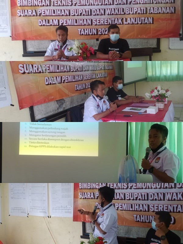 KPU Tabanan, Dangin Carik – Dalam rangka persiapan Tahapan Pemungutan dan Penghitungan Suara Pemilihan Bupati dan Wakil Bupati Tabanan dalam Pemilihan Serentak Lanjutan 2020 dan sesuai Surat Plh. Ketua KPU Kabupaten Tabanan, Nomor 1821/PL.02.6-SD/5102/KPU-Kab/XI/2020, tanggal 14 November 2020, tanggal 14 November 2020. Berkenaan dengan itu, Komisioner KPU Tabanan Ketua Divisi Perencanaan, Data dan Informasi, I Ketut Sugina, sebagai Narasumber yang didampingi Staf Sekretariat KPU Tabanan, memberikan Bimbingan Teknis (Bimtek) Pemungutan dan Penghitungan Suara (Tungsura) Pemilihan Bupati dan Wakil Bupati Tabanan kepada Ketua dan Anggota Panitia Pemungutan Suara (PPS) Se-Kecamatan Selemadeg Timur, pada Pukul 13.00 Wita, bertempat di SMP Negeri 1 Selemadeg Timur, beralamat di Jalan Kahyangan Bunut Puhun,Desa Bantas, Kecamatan Selemadeg Timur, Senin (16/11/2020). Hadir pula Ketua dan Anggota Panitia Pemilihan Kecamatan (PPK) Selemadeg Timur sekaligus memfasilitasi kegiatan tersebut yang sebelumnya telah berkoordinasi dengan Camat di wilayah kerjanya. Pada kesempatan itu, I Ketut Sugina menyampaikan 12 hal baru di Tempat Pemungutan Suara (TPS) yang akan diterapkan dalam Pemilihan Serentak yang akan digelar pada hari Rabu, tanggal 9 Desember tahun 2020 mendatang, diantaranya Jumlah Pemilih di TPS maksimal 500 Orang, pengaturan kedatangan Pemilih ke TPS, Petugas KPPS sehat dan sudah mengikuti Rapid Test, penyemprotan disinfektan di TPS serta pengaturan jarak. Pemilih dan Petugas wajib memakai masker, memakai pelindung wajah, memberikan sarung tangan plastik untuk Pemilih, tidak bersalaman, pengecekan suhu tubuh, wajib mencuci tangan dan sebagai tanda telah memilih tidak memakai tinta celup tetapi tinta tetes. “Kalau ada Pemilih yang suhu tubuhnya di atas 37,3 derajat celcius akan diarahkan memilih pada bilik suara khusus. Nantinya di masing-masing TPS terdapat 3 bilik suara yakni 1 bilik suara khusus dan 2 untuk bilik suara umum. Terkait jaringan internet dari 1.130 TPS, ada 87 jaringan lemah dan KPU Tabanan telah berkoordinasi dengan pihak terkait,” jelasnya. Selain itu, I Ketut Sugina juga menjelaskan materi terkait Tungsura dengan menggunakan aplikasi Sistem Informasi Rekapitulasi (Sirekap) disertai dengan menunjukan cara menggunakannya, mulai dari mendownload aplikasi pada HP android dan langkah-langkah selanjutnya. Beliau juga membawa contoh formulir yakni Model C-KWK serta menjelaskan cara pengisiannya. “Walaupun penggunaan aplikasi Sirekap belum final akan digunakan dalam penghitungan Suara dalam Pilkada Serentak 2020, tapi KPU Tabanan mempunyai kewajiban untuk menyampaikannya kepada Badan Ad Hoc dan apabila nantinya akan jadi digunakan Penyelenggara sudah siap,” ungkapnya. “Melalui Bimtek ini, Kami harapkan supaya Jajaran Penyelenggara memahami proses Tungsura, sehingga meminimalisir adanya kesalahan dalam pelaksanaannya nanti,” tambahnya. Acara Bimtek ini juga diisi dengan sesi Tanya jawab, dan menjelang berakhirnya acara Ketua PPK Selemadeg Timur, mengatakan, “Kami akan melaksanakan touring untuk mensosialisasikan Pilkada Tabanan melalui pengeras suara dengan menggunakan mobil KPU Tabanan dan kepada teman-teman PPS tetap jaga stamina dan kesehatan.” Sebagai informasi, Hari ini merupakan hari pertama Sosialisai Tungsura kepada PPS di Kabupaten Tabanan. Selanjutnya Bimtek yang sama akan dilaksanakan KPU Tabanan di masing-masing Kecamatan yang ada di Kabupaten Tabanan dan difasilitasi oleh PPK. Kegiatan yang dilaksanakan dalam situasi pandemi Covid-19 atau Virus Corona, dengan tetap memperhatikan Protokol Kesehatan seperti physical distancing atau menjaga jarak fisik, menggunakan masker, pengecekan suhu/temperatur tubuh dengan thermogun, menggunakan hand zanitizer atau cairan pembersih tangan serta mencuci tangan dengan sabun dan air mengalir.