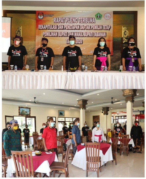 Untuk diketahui, KPU Tabanan menyelenggarakan Rapat Pleno Terbuka Rekapitulasi dan Penetapan Daftar Pemilih Tetap (DPT) Pemilihan Bupati dan Wakil Bupati Tabanan tahun 2020, dengan mengundang Pemangku Kepentingan yang ada di Kabupaten Tabanan, sesuai dengan sesuai Surat Undangan Ketua Komisi Pemilihan Umum (KPU) Kabupaten Tabanan, Nomor 1340/PL.02.1-Und/5102/KPU-Kab/X/2020, tanggal 14 Oktober 2020.