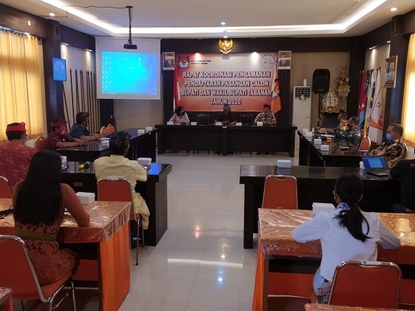 KPU Tabanan, Dangin Carik – Sesuai Surat Undangan Ketua Komisi Pemilihan Umum (KPU) Tabanan, Nomor 1034/PP.06.02-Und/5102/KPU-kab/VIII/2020, tanggal 26 Agustus 2020 dan dalam rangka persiapan Rekapitulasi Daftar Pemilih Hasil Pemutakhiran (DPHP) dalam Pemilihan Bupati dan Wakil Bupati Tabanan 2020. Jumat, (28/08/2020), KPU Tabanan melaksanakan Rapat Koordinasi (Rakor) dengan Peserta Undangan dari Dinas Kependudukan dan Pencatatan Sipil (Disdukcapil) Tabanan, Badan Pengawas Pemilihan Umum (Bawaslu) Tabanan serta dari Panitia Pemilihan Kecamatan (PPK) Se-Kabupaten Tabanan dalam hal ini Ketua PPK Tabanan dengan mengajak 1 Orang Anggotanya yang membidangi Data. Acara dimulai Pukul 10.00 Wita, bertempat di Ruang Rapat Kantor KPU Tabanan. Acara dibuka Ketua KPU Tabanan, I Gede Putu Weda Subawa dan dihadiri Anggota KPU Tabanan, Ketua Divisi Perencanaan, Data dan Informasi, I Ketut Sugina, Ketua Divisi Teknis Penyelenggaraan, Luh Made Sunadi serta Ketua Divisi Hukum dan Pengawasan, I Wayan Sutama. Sedangkan Ni Putu Suaryani yang merupakan Ketua Divisi Sosialisasi dan SDM, sedang melaksanakan tugas dalam rangka sosialisasi Peraturan KPU nomor 5 Tahun 2020 kepada Karang Taruna Se-Kecamatan Selemadeg Barat yang berlangsung di Ruang Rapat Kantor Camat Selemadeg Barat. Dalam kesempatan ini, I Ketut Sugina menanyakan kepada PPK se Kabupaten Tabanan, apakah ada kendala atau permasalahan yang dihadapi di lapangan terkait Rekap Pemilih. Diawali dari Kecamatan Marga, dilanjutkan PPK Tabanan. “Kami di lapangan menemukan dobel identitas dan terdapat juga perbedaan nomor NIK. Hal itulah yang menyebabkan kesulitan di bawah, kadang-kadang ketika PPDP menanyakan kepada Pemilih NIK nya berbeda, ungkap Ketua PPK Tabanan. Diteruskan dari PPK Kerambitan yang menghadapi kendala yaitu terdapat Pemilih yang meninggal dunia tetapi belum memiliki Akta Kematian dan ditemukan juga Pemilih yang belum melakukan perekaman KTP. Kemudian dari PPK Kediri mengatakan, “Permasalahan Kami hamper sama dengan di Kecamatan lainnya yaitu terdapat data di KK berbeda dengan di KTP serta ada juga Pemilih yang belum melakukan perekaman KTP.” Lanjut dari PPK Baturiti dan Selemadeg, menyampaikan permasalahannya hampir sama dengan kecamatan lain yaitu terdapat Warga yang belum melakukan Perekaman. Pada kesempatan ini juga dilaksanakan penyerahan Rekap Pemilih dari masing-masing PPK kepada pihak Disdukcapil Tabanan untuk ditindaklanjuti. Kendala di lapangan selanjutnya disampaikan dari PPK Selemadeg Timur yangmana terdapat pula Pemilih yang belum melakukan perekaman dan belum memiliki Akta Kematian. Selanjutnya giliran PPK Pupuan menyampaikan kendala yang dihadapi di lapangan dan terakhir dari PPK Selemadeg Barat. “Terdapat 3 Kecamatan saat ini yang belum bisa melaksanakan Perekaman diantaranya Kecamatan Marga, Baturiti dan selemadeg Timur karena alat rusak, ungkap I Wayan Januada dari pihak Disdukcapil Tabanan. Beliau juga menjelaskan proses terkait penerbitan Akta Kematian. Menjelang berakhirnya acara, Komisioner Bawaslu Tabanan, Kordiv. Pencegahan Hubungan antar Lembaga, I Ketut Narta, turut menyampaikan tanggapan dan masukannya terkait DPHP. “Dengan Rakor ini Kami ingin menyamakan persepsi dalam penyusunan DPHP, harapannya semoga dalam Pleno nanti masalah-masalah non teknis tidak ada lagi sehingga Pleno bisa berjalan dengan lancar,” tandas I Ketut Sugina. Kegiatan yang dilaksanakan dalam situasi pandemi Covid-19 atau Virus Corona, dengan tetap memperhatikan Protokol Kesehatan seperti physical distancing atau menjaga jarak fisik, menggunakan masker, pengecekan suhu/temperatur tubuh dengan menggunakan thermogun serta menggunakan hand zanitizer atau cairan pembersih tangan serta mencuci tangan dengan sabun dan air mengalir.