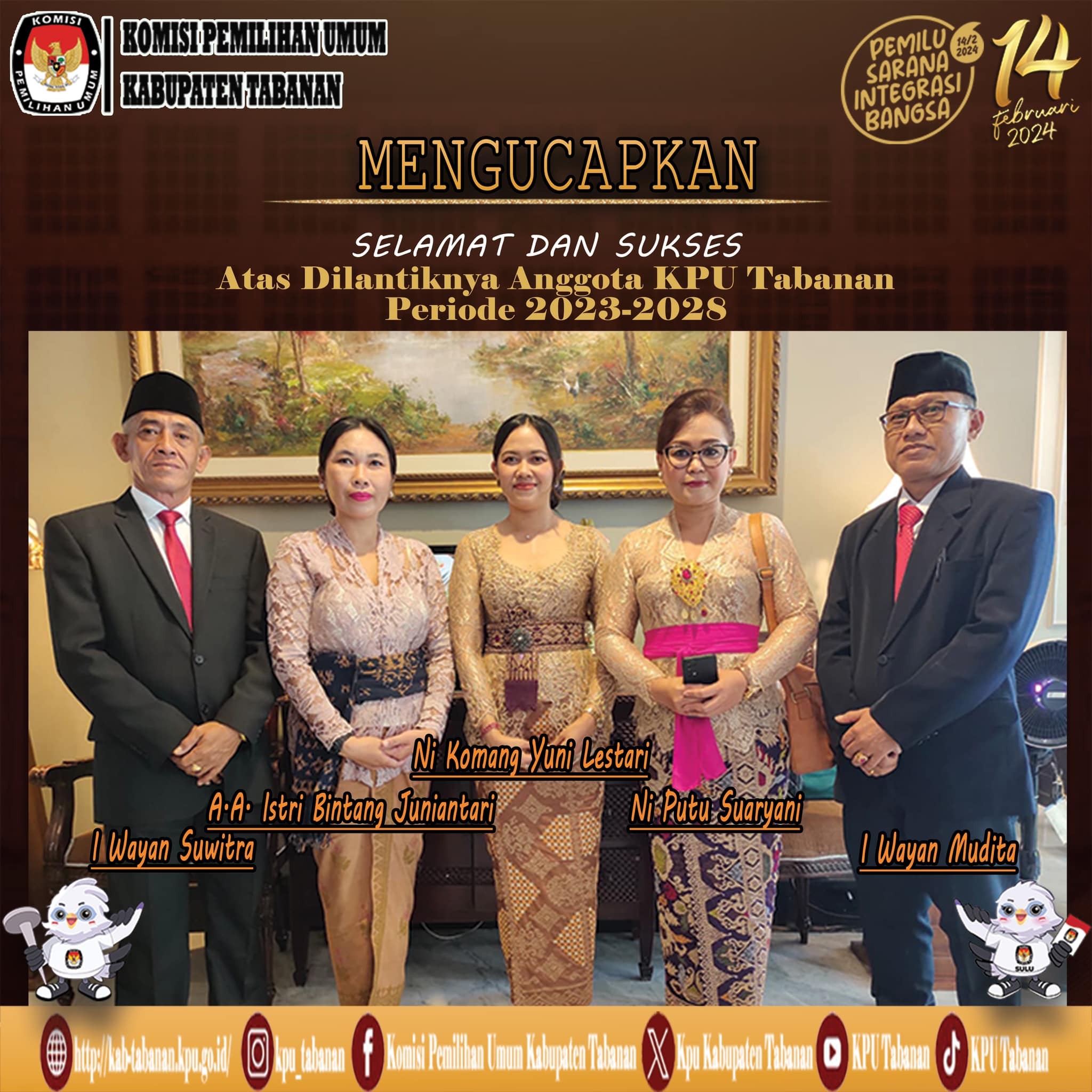 Maka ditetapkanlah nama – nama Calon Anggota KPU Tabanan yang terpilih yakni A. Istri Bintang Juniantari, I Wayan Mudita, I Wayan Suwitra, Ni Komang Yuni Lestari dan satu – satunya incumbent yaitu Ni Putu Suaryani.
