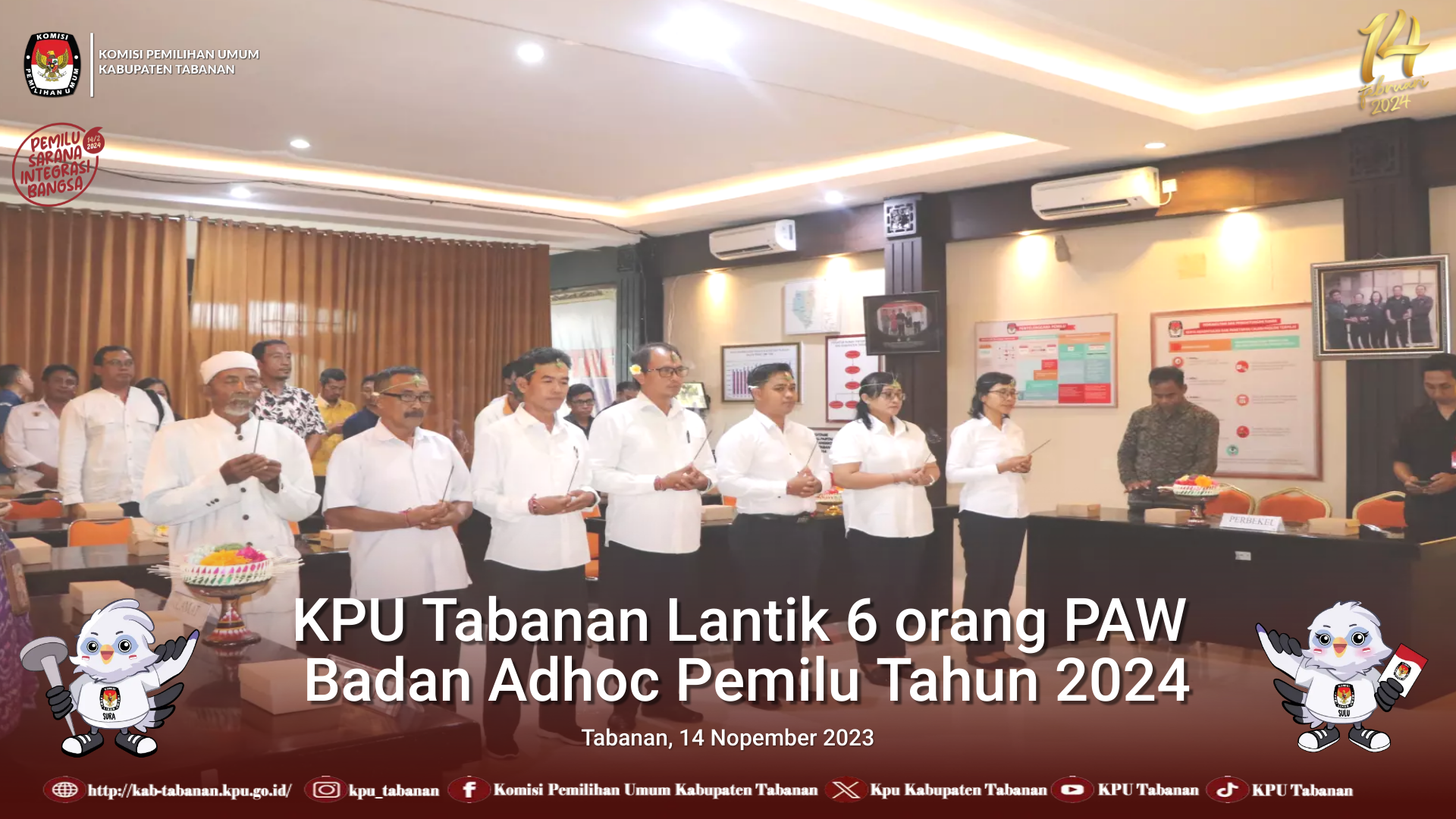 Dangin Carik, Di Ruang Rapat Kantor KPU Tabanan, Selasa 14 Nopember 2023 KPU Tabanan telah lantik 6 Pengganti Antar Waktu Badan Adhoc Pemilu Tahun 2024. Plh. Ketua KPU Tabanan, Ni Komang Yuni Lestari mengambil Sumpah dan Melantik 3 PAW Anggota Panitia Pemilihan Kecamatan ( PPK ). PPK tersebut diantaranya PPK Kecamatan Tabanan an Desak Ayu Sri Utami Dewi mengantikan I Wayan Suwitra, kemudian an Ni Wayan Sukanasih menggantikan Ni Komang Yuni Lestari. PPK Kecamatan Kerambitan an I Gd Km Agus Pande Suryawan menggantikan I Wayan Mudita. Penggantian Antar Waktu ini dilakukan oleh KPU Tabanan karena 3 Anggota PPK ini telah resmi dilantik sebagai Anggota KPU Kabupaten Tabanan periode 2023 – 2028. Pengambilan Sumpah dan Pelantikan juga dilakukan kepada 3 Orang PAW Anggota Panitia Pemungutan Suara ( PPS ), yakni PPS Desa Sudimara an I Ketut Pinda menggantikan Ni Wayan Sukanasih, PPS Desa Sesandan an I da Bagus Gde Surya Sukrantara menggantikan Desak Ayu Sri Utami dan PPS Desa Kelating an I Made Semadi menggantikan I Gd KM Agus Pande Suryawan, 3 PAW Anggota PPS ini menggantikan 3 Anggota PPS sebelumnya yang per hari ini telah menjadi Anggota PPK di Kecamatan yang tersebut diatas. Hadir Anggota KPU Provinsi Bali mewakili Ketua, Luh Putu Sri Widiyastini yang merupakan Korwil Tabanan memberikan sambutannya dan ucapan selamat kepada PAW PPK dan PPS yang telah dilantik. “ Bapak Ibu yang baru saja dilantik secara berantai getok tularkan pengetahuan Pemilunya serta pengalaman sebelumnya agar bapak Ibu bisa langsung bekerja karena Tahapan telah berjalan begitu padatnya, serta hari H Pemungutan Suara sudah didepan mata, jaga Intergritas dan mari sukseskan Pemilu Serentak 2024 ini,” ucap Sriwidyastini mengakhiri sambutannya. “ Saya sebagai Plh. Ketua hari ini mohon permakluman karena Ketua sedang berada diluar daerah menjalankan tugas kepemiluan yang tidak dapat ditinggalkan, begitu pula 3 teman kami Komisioner KPU Tabanan lainnya juga sedang dalam tugas. Sekali lagi saya sangat berbahagia karena Pengambilan Sumpah dan Pelantikan hari ini berjalan lancar dan kita tentunya telah siap untuk melanjutkan Tahapan Pemilu 2024 ini,” Yuni Lestari. G/P