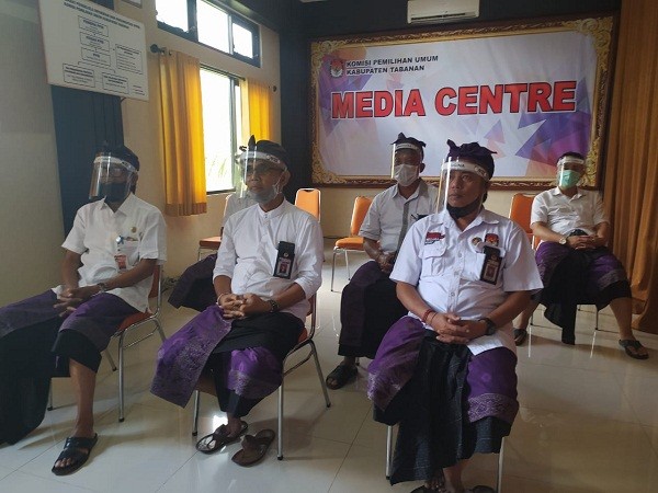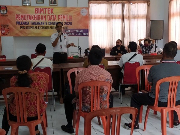 KPU Tabanan, Dangin Carik – Dalam rangka Pemilihan Bupati dan Wakil Bupati Tabanan Tahun 2020 yang akan digelar pada tanggal 9 Desember 2020, Jajaran KPU Tabanan melaksanakan Bimtek Teknis Pemutakhiran Data Pemilih bagi PPK dan PPS di 5 Kecamatan dari 10 Kecamatan yang ada di Kabupaten Tabanan, Selasa (07/07/2020), bertempat di masing-masing Kecamatan diantaranya, Tabanan, Penebel, Marga, Selemadeg Timur dan Kecamatan Selemadeg Barat. Sisanya untuk Kecamatan Kerambitan, Kediri, Baturiti, Selemadeg dan Pupuan akan diberikan Bimtek pada hari Kamis tanggal 9 Juli 2020. Sebagai Pemateri adalah Komisioner KPU Tabanan. Di Kecamatan Tabanan diberikan Bimtek oleh Anggota KPU Tabanan, I Ketut Sugina yang juga merupakan Ketua Divisi Perencanaan, Data dan Informasi. Anggota KPU Tabanan, Ketua Divisi Sosialisasi dan SDM, Ni Putu Suaryani bertugas di Kecamatan Penebel. I Wayan Sutama yang merupakan Anggota KPU Tabanan, Ketua Divisi Hukum dan Pengawasan memberikan materi di Kecamatan Marga. Sedangkan di Kecamatan Selemadeg Timur diberikan oleh Anggota KPU Tabanan, Ketua Divisi Teknis Penyelenggaraan, Luh Made Sunadi dan Ketua KPU Tabanan, I Gede Putu Weda Subawa mendapatkan tugas di Kecamatan Selemadeg Barat. Masing-masing Komisioner difasilitasi oleh Staf Sekretariat KPU Tabanan. Disetiap Kecamatan tampak Panwascam Pilkada 2020 mengawasi jalannya Kegiatan. “Dalam menjalankan tugas pergunakanlah Alat Pelindung Diri sesuai Protokol Kesehatan, minimal Masker. Dalam melaksanakan Coklit, PPDP nanti harus minta ijin dan sopan saat memasuki rumah warga,” ucap Pak Weda saat memberikan Bimtek di Kecamatan Selemadeg Barat. “Bagaimana caranya meyakinkan masyarakat agar nanti mau datang ke TPS ,” tambahnya. Pada kesempatan itu Pak Weda juga mengatakan, “ Tanggal 14 juli terkait Daring Meeting Apel Siaga, nanti Kita akan undang juga Panwascam. Tetap jaga solidaritas Bapak dan Ibu semua. Saya yakin teman-teman disini tetap solid. Harapan Kami tetap berkoordinasi, apalagi dalam masa Pandemi Covid-19 ini.” “Berkoordinasi dan bekerjasama itu adalah hal yang utama,” ucap salah satu peserta Bimtek di Kecamatan Selemadeg Barat saat diskusi. Pada kesempatan tersebut Ketua PPK Selemadeg Barat juga menyampaikan, “Secara umum Daring Meeting yang pernah Kami lakukan dapat berjalan dan harapan Kami semoga Pilkada Tabanan 2020 dapat berjalan dengan aman dal lancar. Sebelum acara Bimtek ditutup oleh Ketua PPK Selemadeg Barat, Pak Weda menyampaikan terima kasih kepada PPS yang sudah hadir dan PPK yang sudah memfasilitasi. “Hari ini KPU Tabanan melakukan Bimtek Pemutakhiran Data Pemilih bagi PPK dan PPS yang Kami selenggarakan di 5 Kecamatan secara berbarengan yaitu di Kecamatan Tabanan, Selemadeg Timur, Selemadeg Barat, Pupuan, Penebel dan Marga. Tujuannya adalah memberikan Bimbingan Teknis kepada Penyelenggara di Tingkat Kecamatan dan Desa untuk nanti melakukan Bimtek terhadap Petugas Kita yang di TPS yaitu Petugas Pemutakhiran Data Pemilih (PPDP). Bimtek ini materinya bagaimana teman-teman PPDP untuk melakukan Pemutakhiran Data Pemilih utamanya Coklit. Bimtek hari ini untuk memberikan pemahaman secara teknis kepada teman –teman Penyelenggara untuk tahu betul bagaimana proses Coklit di bawah. Selanjutnya Petugas PPDP akan melakukan Coklit dari tanggal 15 Juli s/d tanggal 13 Agustus 2020,” ungkap I Ketut Sugina yang membidangi Pemutakhiran Data Pemilih saat diwawancarai Staf Humas KPU Tabanan, bertempat di Kantor KPU Tabanan. Sasarannya adalah teman –teman PPK, PPS dan PPDP mengetahui bagaimana proses Coklit yang sebenarnya, bagaimana menandai di Formulir Model A-KWK kemudian mengubah data di Formulir Model A-KWK dan yang terakhir adalah mencoret Pemilih yang tidak memenuhi syarat (TMS). Itu ada 9 katagori, Kita berikan Bimbingan secara teknis dan langsung praktek bagaimana teknik teman-teman mencoret kemudian menandai dan mengisi kodenya. Disamping itu juga untuk mensosialisasikan kepada mereka pada saat pelaksanaan Coklit tetap mempergunakan Protokol Kesehatan,” bebernya. Selain itu I Ketut Sugina juga mengatakan, “Petugas Kami yang datang ke TPS nanti dilengkapi dengan APD yaitu masker, sarung tangan dan Face Shield. Jadi Masyarakat diharapkan nanti tidak takut dengan Petugas tersebut. Kami juga permaklumkan kepada Masyarakat Tabanan bahwa dari tanggal 15 Juli s/d 13 Agustus 2020 ada Petugas Kami yang Kita kenal dengan PPDP itu nanti lengkap menggunakan atribut seperti topi, Face Shield dan masker. Mereka akan mendata Bapak dan Ibu. Tolong kepada Bapak dan Ibu Warga Tabanan nanti, ketika Petugas Kami datang disiapkan kelengkapan administrasi kependudukannya seperti KTP, KK dan Surat Keterangan lainnya,” tambah I Ketut Sugina. Kegiatan yang dilaksanakan dalam situasi Pandemi Covid-19 atau Virus Corona ini, tetap memperhatikan petunjuk-petunjuk penanggulangan Covid-19 seperti physical distancing atau jarak fisik dan dengan menggunakan masker.