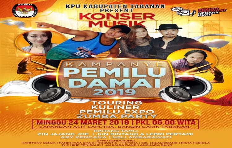 KPU Kabupaten Tabanan baru saja selesai menggelar technical meeting terkait Acara Sosialisasi Kampanye Damai dirangkaian dengan hiburan Konser Musik,Zumba Party,Touring Motor dan banyak lagi acara hiburan lainnya yang akan di selenggarakan pada hari Minggu, 24 Maret 2019 bertempat di Lapangan Alit Saputra Dangin Carik Tabanan. Acara di buka untuk umum dan Gratis tidak dikenakan biaya apapun.Acara akan dimulai pada pukul 06.30 wita mengundang ZIN(Zumba Instruktur Network) terkenal,dan juga untuk Hiburan Musik KPU Tabanan akan menghadirkan artis Bali yang sedang naik daun saat ini .Ada Jun Bintang dan Lebri Partami serta artis lainnya.