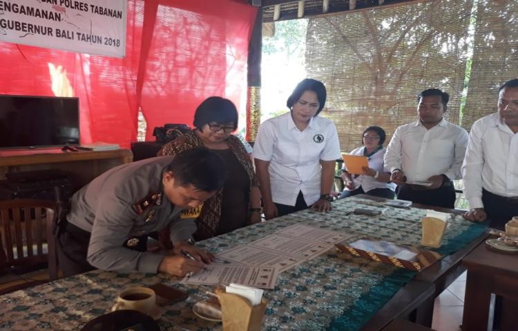 Pada Hari Rabu 23 Mei 2018, pada Pukul 10.00 WITA yang bertempat di Rumah Makan Sawira Tabanan, dilaksanakan Penandatanganan Kesepakatan bersama antara Komisi Pemilihan Umum Kabupaten Tabanan dan Polres Tabanan, dalam rangka pengamanan Pemilihan Gubernur dan Wakil Gubernur Bali Tahun 2018, dari pihak Komisi Pemilihan Umum Kabupaten Tabanan dihadiri oleh Ketua Komisi Pemilihan Umum Kabupaten Tabanan, Luh Darayoni, SH. dan dari pihak Polres Tabanan diwakili oleh Wakapolres Tabanan, Kompol I Ketut Widiada, S.I.K yang dipasilitasi oleh Kasat Intelkam Polres Tabanan, AKP Ni Luh Komang Sri Subakti, SH.,MH