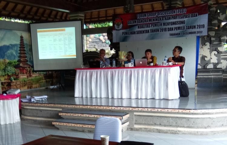 Peserta FGD dari Praktisi Akademisi Universitas Tabanan, STISIP Margarana, IKIP Saraswati, Stikes Advaita Tabanan, Kepala Kesbang Pol. Kabupaten Tabanan, Ketua Parpol Se-Kabupaten Tabanan, Ketua PPK Se- Kabupaten Tabanan, Pewarta, Forum Kerukunan Umat Beragama Kabupaten Tabanan dari perwakilan Agama Hindu, Islam Kristen Katolik, Kristen Protestan dan Budha.