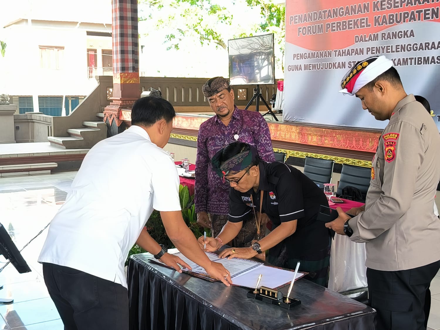 KPU Tabanan, Dangin Carik – Penuhi undangan Kapolres Tabanan untuk memberikan sambutan teknis tugas Komisi Pemilihan Umum (KPU) Kabupaten Tabanan pada acara penandatanganan kesepakatan bersama Forum Perbekel Se-Kabupaten Tabanan, maka Ketua KPU Tabanan, I Gede Putu Weda Subawa, hadir dalam kegiatan dimaksud sekaligus ikut menandatangani kesepakatan, bertempat di wantilan Desa Adat Bedha, Kamis (20/07/2023).