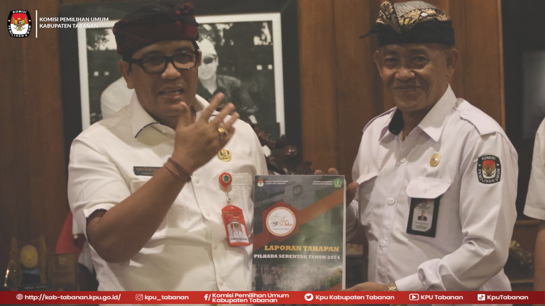 KPU Tabanan lakukan audiensi dan diterima oleh Bupati Tabanan, Dr. I Komang Gede Sanjaya, S.E., M.M. beserta jajaran. Audiensi dari KPU Tabanan dilaksanakan oleh Ketua beserta seluruh anggota, Sekretaris didampingi satu kasubbag KPU Tabanan serta turut hadir Ketua KPU Provinsi Bali, I Dewa Agung Gede Lidartawan. Dalam audiensi tersebut selain menyampaikan rasa terimakasih atas segala dukungan dari pemerintah daerah sehingga KPU Tabanan sebagai penyelenggara Pemilihan Serentak 2024 dapat menyelesaikan seluruh tahapan dengan lancar dan sukses, pada kesempatan ini KPU Tabanan juga menjawab pertanyaan Bupati Tabanan akan program dan kegiatan KPU Tabanan kedepan usai pelaksanaan Pemilihan Serentak 2024 ini. Hal yang sama juga disampaikan oleh KPU Tabanan ketika berada dikediaman Ketua DPRD Tabanan, I Nyoman Arnawa, S.Sos. Diserahkan juga laporan pelaksanaan tahapan Pemilihan Serentak 2024 dalam bentuk buku laporan kepada Bupati dan Ketua DPRD Tabanan oleh Ketua KPU Tabanan, I Wayan Suwitra, S.H.