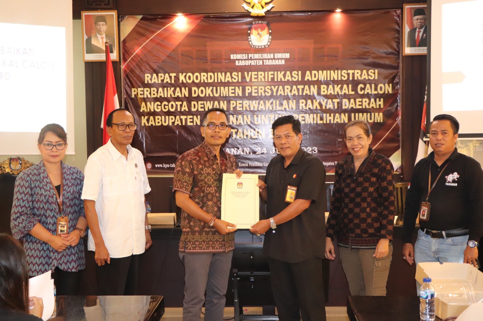 KPU Tabanan, Dangin Carik – Dalam rangka pelaksanaan Tahapan Pemilu Serentak 2024 dengan berpedoman pada Peraturan Komisi Pemilihan Umum (KPU) Nomor 10 Tahun 2023 Tentang Pencalonan Anggota Dewan Perwakilan Rakyat, Dewan Perwakilan Rakyat Daerah Provinsi, dan Dewan Perwakilan Rakyat Daerah Kabupaten/Kota, KPU Kabupaten Tabanan mengadakan Rapat Koordinasi Verifikasi Administrasi (Vermin) Perbaikan Dokumen Persyaratan Bakal Calon Anggota DPRD Kabupaten Tabanan untuk Pemilu Tahun 2024, pukul 10.00 Wita, bertempat di ruang rapat Kantor KPU Tabanan, Sabtu (24/06/2023). Hadir Ketua KPU Tabanan sekaligus membuka acara yakni I Gede Putu Weda Subawa. Turut hadir seluruh Anggota KPU Tabanan termasuk Luh Made Sunadi yang merupakan Anggota KPU Tabanan Ketua Divisi Teknis Penyelenggaraan sekaligus yang menggawangi kegiatan ini. Sedangkan undangan yang hadir berasal dari Pengurus Partai Politik yang ada di Kabupaten Tabanan, masing-masing Parpol juga mengajak 1 Orang Operator SILONnya. Dari Bawaslu Kabupaten Tabanan diwakili oleh Anggota Bawaslu Tabanan yaitu I Made Winarya. Kegiatan diisi dengan menyanyikan lagu kebangsaan Indonesia Raya dan Jingle Pemilu Serentak 2024 dilanjutkan Doa bersama dan arahan Ketua KPU Tabanan. Sebagai Pemateri adalah Luh Made Sunadi, “Tanggal 26 Juni 2023 sampai tanggal 9 Juli 2023 merupakan tahapan pengajuan perbaikan dokumen persyaratan Bakal Calon,” ungkapnya. Dikatakannya juga, “Waktu penyerahan perbaikan di hari I sd hari ke-13 dilaksanakan mulai pukul 08.00 Wita – 16.00 Wita, hari terakhir pada pukul 08.00 Wita hingga 23.59 Wita. Partai Politik tidak bisa menambah jumlah Bakal Calon yang telah diajukan pada masa pengajuan.” Sesi diskusi juga meramaikan acara ini dirangkai dengan penyerahan Berita Acara terkait hasil verifikasi administrasi dokumen persyaratan Bakal Calon Anggota DPRD Kabupaten Tabanan untuk Pemilu tahun 2024 kepada perwakilan Partai Politik dan kepada Bawaslu Tabanan. (Humas KPU Tabanan).
