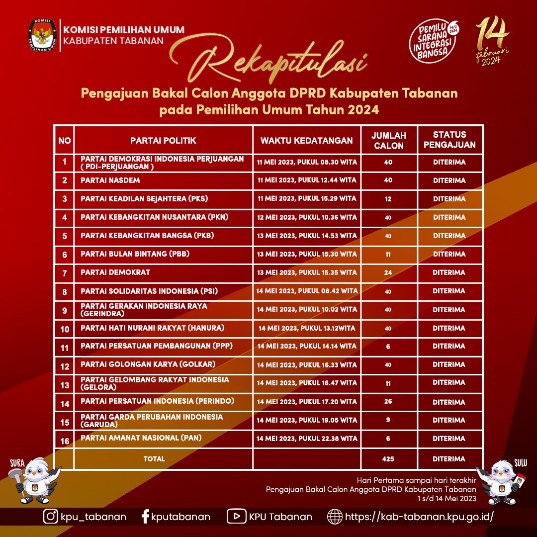 Selain itu, Partai Gelombang Rakyat ( GELORA ) ajukan Bakal Calon Anggota DPRD Kabupaten Tabanan di KPU Tabanan. GELORA diterima oleh KPU Tabanan, Minggu ( 14/5 ) Pukul : 14.55 wita. Dalam pengajuan tersebut hadir Ketua DPD Gelora Tabanan, Dwi Koman Prasetyo , Sekretaris dan jajaran, Bacaleg, LO dan Admin Silon. KPU Tabanan melakukan pengecekan berkas pengajuan oleh admin dan operator, kemudian KPU Tabanan memberikan status DITERIMA karena berkas pengajuan telah lengkap dan diterima.”
