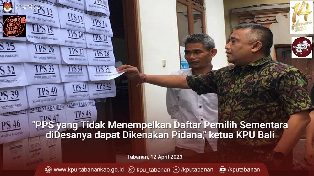 KPU Tabanan, Dangin Carik – Melansir unggahan media sosial Komisi Pemilihan Umum (KPU) Kabupaten Tabanan hari Kamis tanggal 13 April 2023, “Daftar Pemilih Sementara (DPS) telah diumumkan oleh masing- masing Panitia Pemungutan Suara (PPS) dan ditempelkan serentak di 133 Kantor Desa yang ada di Kabupaten Tabanan, Rabu ( 12/04 ). Ketua KPU Provinsi Bali, I Dewa Agung Gede Lidartawan, didampingi Ketua KPU Kabupaten Tabanan, I Gede Putu Weda Subawa beserta Jajaran hingga Panitia Pemilihan Kecamatan (PPK) melaksanakan monitoring terhadap pelaksanaan penempelan DPS tersebut. Lidartawan ingin memastikan agar seluruh Kantor Desa sudah menempelkan pengumuman tersebut supaya Warga dapat mengetahui apakah nama mereka telah masuk atau belum dalam daftar Pemilih sementara Pemilu Serentak 2024. "PPS yang tidak menempelkan DPS ini dapat dikenakan Pidana loh, sesuai UU No. 7 Tahun 2017, Kita tidak mau ada Penyelenggara yang seperti itu, khususnya di Kabupaten Tabanan,"ujar Lidartawan. Monitoring penempelan DPS ini dilaksanakan oleh KPU Tabanan yang telah terbagi menjadi beberapa Tim dan turun sesuai wilayah yang telah ditentukan. "Kepada Warga yang tidak sempat datang ke Kantor Desa, bisa lakukan cek mandiri dengan mengakses aplikasi yang dimiliki KPU pada link cekdptonline.kpu.go.id.," tambah Weda Subawa." (Humas KPU Tabanan).