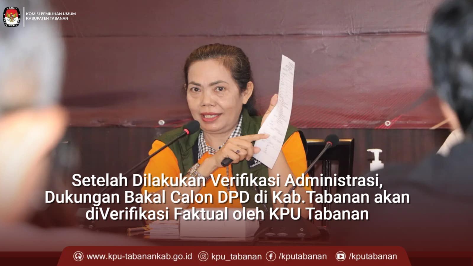 Sebagai Pemateri adalah Anggota KPU Tabanan Ketua Divisi Teknis Penyelenggaraan, Luh Made Sunadi. “ Tugas KPU Kabupaten/Kota dalam pelaksanaan verifikasi dukungan DPD yakni Verifikasi Administrasi 30 Desember 2022 – 12 Januari 2023, Verifikasi Administrasi (Vermin) Perbaikan Kesatu 23 Januari 2023 – 1 Februari 2023, Verfak Kesatu 6 – 26 Februari 2023, Vermin Perbaikan Kedua 12 – 21 Maret 2023 dan Verfak Kedua nantinya tanggal 26 Maret 2023 – 8 April 2023.”