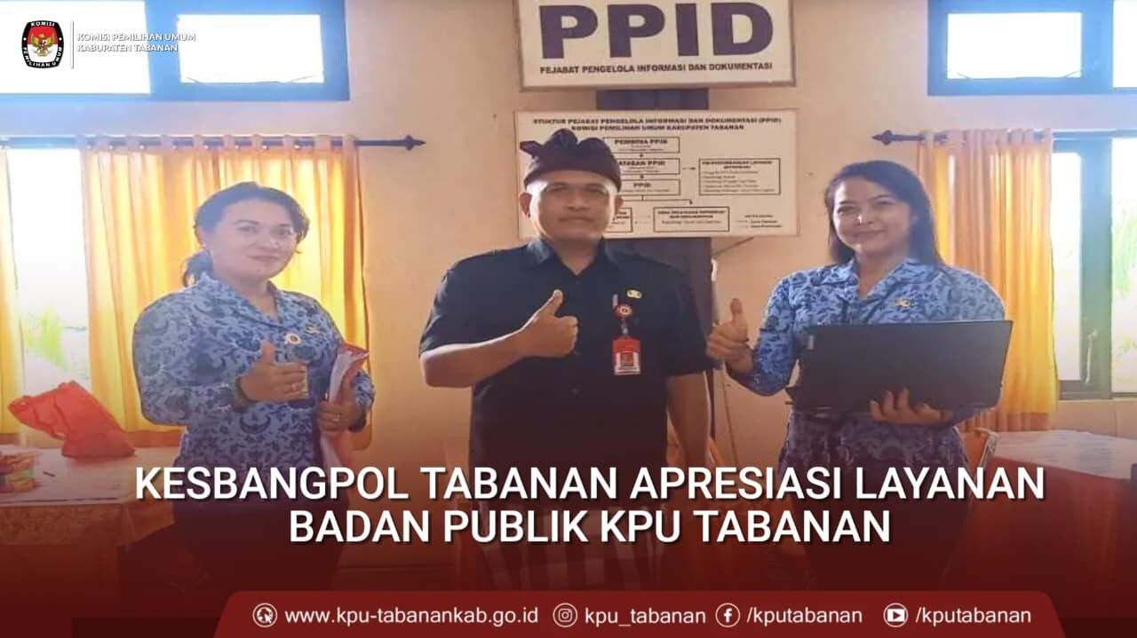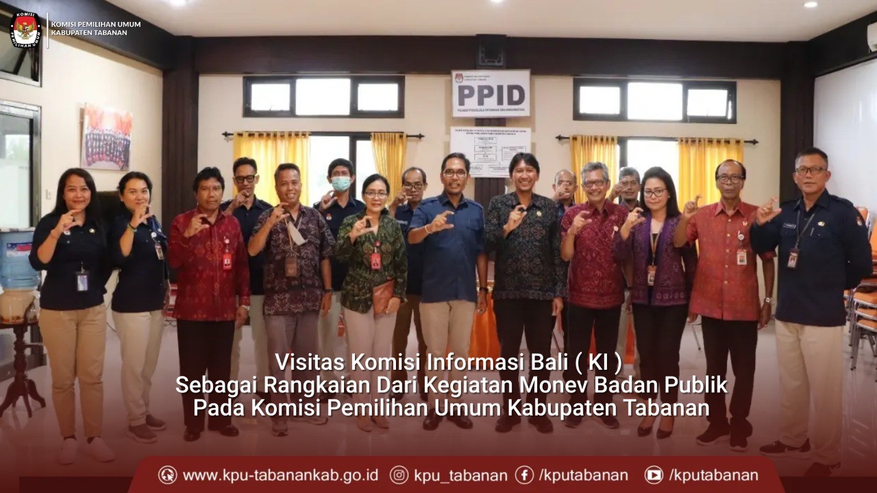 KPU Tabanan, Dangin Carik –.Melansir unggahan media sosial Komisi Pemilihan Umum (KPU) Kabupaten Tabanan hari Selasa (15/11/2022), “KPU Tabanan terima Visitasi Komisi Informasi Provinsi Bali ( KI ) pada Selasa ( 15/11/22 ). Visitasi ini merupakan rangkaian dari monitoring dan Evaluasi (Monev) Badan Publik dari KI kepada ratusan Badan Publik yang ada di Provinsi Bali. KPU Tabanan merupakan Badan Publik kategori Penyelenggara Pemilu yang sebelumnya telah mengisi kuesioner yang dibagikan oleh KI untuk kemudian dievaluasi. Hadir Ketua KI Bali, I Made Agus Wirajaya, bersama Komisioner KI lainnya di Kantor KPU Tabanan dan diterima oleh Ketua KPU Tabanan beserta Jajaran. Dalam visitasinya, KI memberikan masukan dan saran terkait Badan Publik ( Pejabat Pengelola Informasi dan Dokumentasi/PPID ) KPU Tabanan dan mengapresiasi kinerja Tim PPID KPU Tabanan.” Dalam arahannya, I Made Agus Wirajaya mengungkapkan, “Kami sangat terbuka jika Bapak dan Ibu sekalian memerlukan sosialisasi, Kami siap. Dengan memberikan pengetahuan terkait informasi publik Kami harapkan dapat meningkatkan pelayanan informasi publik.” Sedangkan Ketua KPU Tabanan mengungkapkan, “Mudah - mudahan dengan kehadiran Bapak dan Ibu dari Komisi Informasi Bali dapat meningkatkan pelayanan informasi di KPU Tabanan. Kami harapkan Divisi Sosialisasi KPU Tabanan selalu berkomunikasi dengan KI.” “Kami akan berusaha untuk mempertahankan predikat Informatif, harapannya agar Kami tetap dapat dibina dan dibimbing,” ucap Ni Putu Suaryani yang merupakan Anggota KPU Tabanan Ketua Divisi Sosialisasi, Pendidikan Pemilih, Parmas dan SDM. Salah satu Komisioner Komisi Informasi Bali juga menyampaikan bahwa Komisi Informasi Bali berharap semua Badan Publik di Bali dapat Informatif, makanya Kami terus melaksanakan pembinaan dan Kami berharap semoga kegiatan Pemilu dan Pemilihan Serentak 2024 nantinya dapat berjalan sukses. (Humas KPU Tabanan).