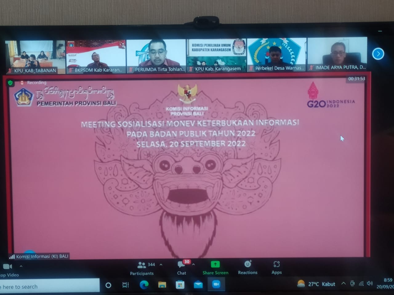 KPU Tabanan, Dangin Carik – Divisi Sosialisasi Komisi Pemilihan Umum (KPU) Kabupaten Tabanan tepatnya Sub Bagian Teknis Penyelenggaraan Pemilu, Partisipasi dan Hubungan Masyarakat Sekretariat KPU Tabanan menghadiri Zoom Meeting sosialisasi monitoring dan evaluasi keterbukaan informasi Badan Publik tahun 2022, bertempat di ruang Rapat Kantor KPU Tabanan, pukul 09.00 Wita, Selasa (20/09/2022). Acara yang diselenggarakan Komisi Informasi (KI) Provinsi Bali itu dihadiri juga dari perwakilan kategori Penyelenggara Pemilu dan Pemilihan (KPU dan Bawaslu) tingkat Kabupaten/Kota Se-Provinsi Bali. Selain itu hadir Badan Publik dari kategori perangkat daerah Pemerintah Provinsi Bali, kategori Instansi vertikal tingkat Provinsi Bali, kategori PPID Pemerintah Kabupaten/Kota, kategori Perangkat Daerah Kabupaten/Kota, kategori BUMD Provinsi, Kabupaten/Kota, kategori Instansi Vertikal tingkat Kabupaten/Kota dan terakhir adalah kategori Pemerintah Desa. Kegiatan diawali dengan menyanyikan lagu kebangsaan Indonesia Raya serta Doa bersama dan dipandu seorang Moderator. Dilanjutkan arahan dari pihak Komisi Informasi Bali. “Keterbukaan informasi publik diharapkan oleh Masyarakat dan juga mempunyai manfaat bagi Masyarakat. Monev ini dilaksanakan oleh KI Bali setiap tahun dan akan rutin dilaksanakan setiap tahun,” ungkapnya. “Keberadaan Kita memang untuk melayani publik, bukan hanya untuk Kita sendiri. Informasi publik adalah hak Warga Negara sehingga keberadaan informasi menjadi sangat penting, Komisi informasi pun pun sangat penting peranannya,” ungkap Sekda Provinsi Bali dalam arahannya. Dilanjutkan pemaparan materi dari Ketua Komisi Informasi Bali, “Dalam mengisi kuesioner isi saja sesuai fakta, seperti yang disampaikan Sekda Bali tadi, jangan berfokus pada nilai. Dasar hukumnya yakni Undang-Undang Nomor 14 tahun 2008 Tentang keterbukaan Informasi Publik dan Peraturan Komisi informasi Nomor 1 Tahun 2021 Tentang Standar Layanan Informasi Publik. Tujuan monev ini untuk ketaatan Badan Publik terhadap Peraturan Perundang-undangan,” jelasnya. Sedangkan menurut Agus Suryawan yang merupakan koordinator bidang Monev mengungkapkan, “Indikator di dalam kuesioner untuk tahun ini antara lain : Indikator sarana dan prasarana, kualitas informasi, jenis informasi, komitmen Organisasi, inovasi dan strategi, digitalisasi dan indikator muatan lokal. Kuesioner dengan nilai atau skor 60 ke atas akan di kunjungan Komisi Informasi untuk melihat kenyataannya, untuk Isi video Badan Publik merupakan inovasi vidio dari tahun 2021 - tahun 2022 untuk dikirim ke Komisi Informasi. Penganugerahan nanti dilaksanakan bulan Desember 2022. Untuk tahun lalu yang Badan Puliknya sudah Informatif untuk tahun ini tidak Kami Monev kembali.” Dijelaskannya pula, “Registrasi mulai besok, 21 September 2022 – 17 Oktober 2022, untuk yang presentasi melalui video adalah inovasi Bapak dan Ibu dari tahun 2021 s/d. tahun 2022 tentang keterbukaan informasi publik. penilaian dari skor 1, 2, 3, 4 dan 5 itu adalah Bapak dan Ibu sendiri yang menilai, Kami nanti akan mengevaluasi. Tanggal 3 - 7 November 2022 pengiriman video, untuk video sedapat mungkin merupakan inovasi pelayanannya seperti apa, pada masa pandemi seperti apa, pasca pandemi seperti apa, manfaatnya seperti apa, penerapan seperti apa dan kolaborasinya seperti apa (misal kolaborasi dengan pihak lain). Kalau bisa menunjukan link atas suatu informasi, itu nilainya lebih bagus dari bukti lainnya, maksimal durasi video 10 menit saja, untuk foto jadikan dulu dalam dokumen word terus dijadikan pdf untuk membatasi ruang pada Google Forms. untuk registrasi itu maksudnya adalah mengisi nama Badan Publik dan lain lain. Pada pengisian kuesioner OPD, BUMN, Desa dan Instansi vertikal itu ada beberapa perbedaan. Karena keterbatasan waktu nanti akan lebih banyak disampaikan dalam Grup.” Acara diisi juga dengan sesi tanya jawab. Sedangkan I Wayan Darma yang juga dari Komisi Informasi Bali dalam kesempatan ini juga menyampaikan materi khusus untuk tingkat Desa. “Link Google Forms jangan dulu diisi, sebisa mungkin lengkapi dulu bukti nya karena ini merupakan pembinaan,” ujarnya. (Humas KPU Tabanan).