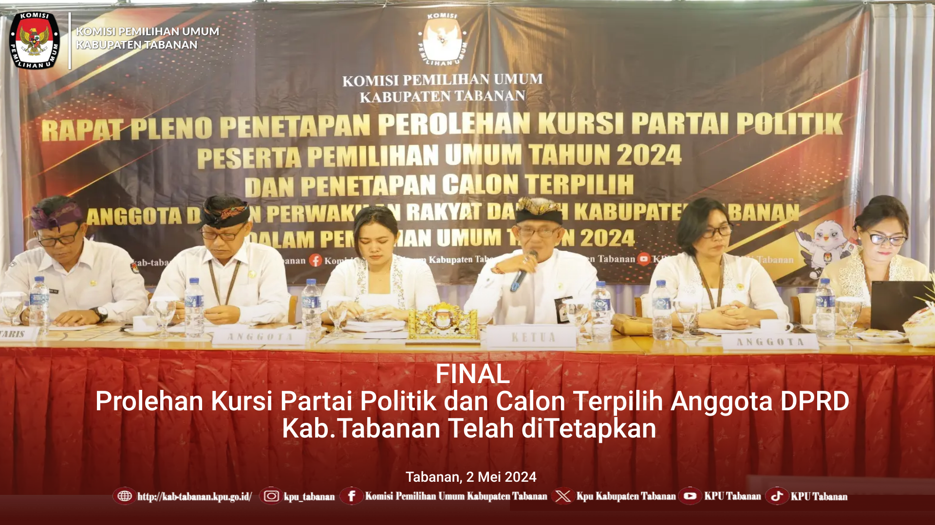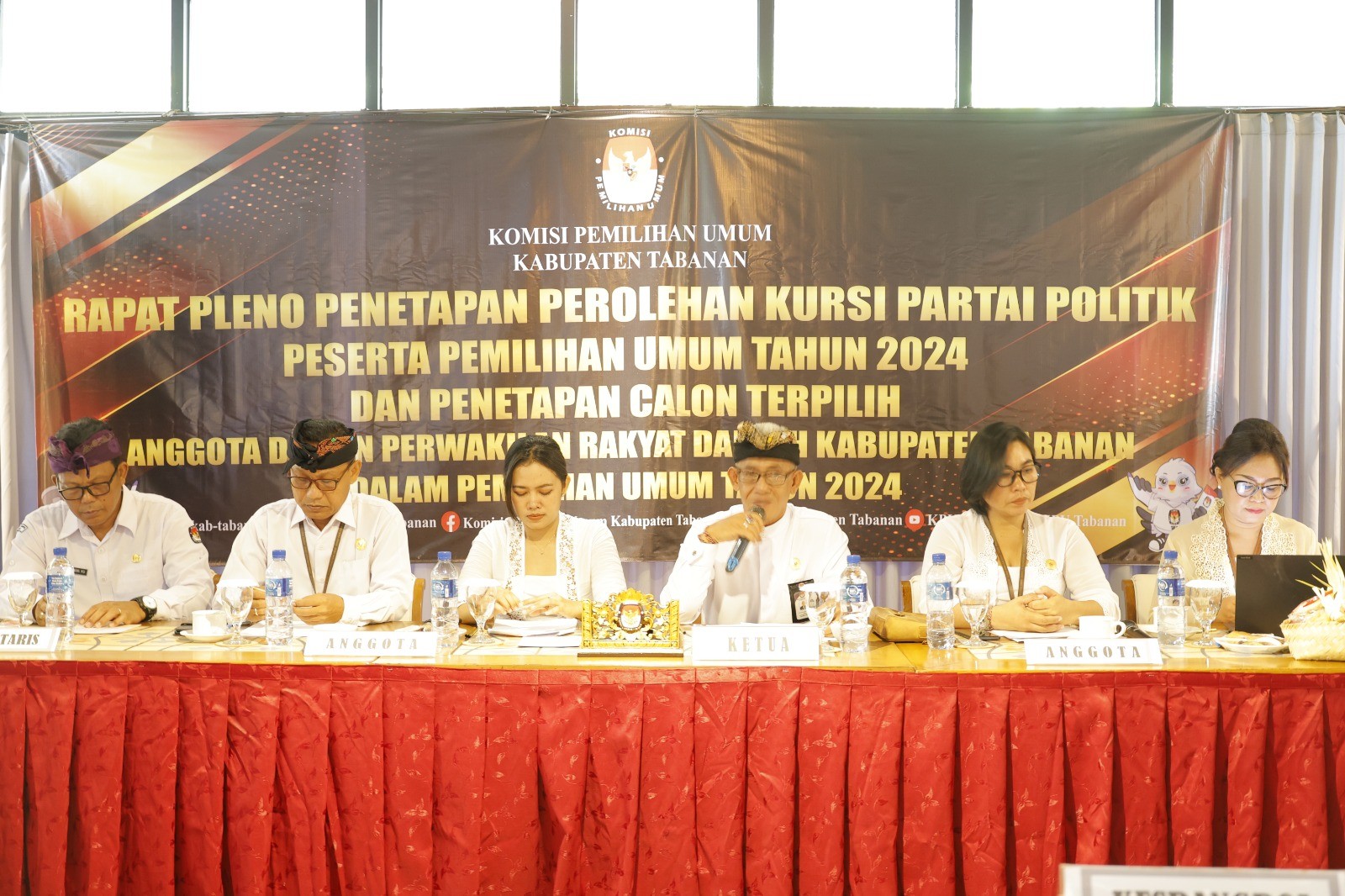Rapat Pleno dibuka oleh Ketua KPU Tabanan, I Wayan Suwitra didampingi oleh 4 Komisioner lainnya serta Sekretaris KPU Tabanan. Rapat Pleno ini dihadiri oleh Bawaslu Tabanan, Stake holder serta Partai Politik Peserta Pemilu Tahun 2024. Rapat tersebut berjalan tertib aman dan lancar sesuai harapan. Salinan Surat Keputusan pun diberikan kepada Undangan yang hadir saat itu. Akhir kata Suwitra ( Ketua KPU Tabanan ) mengucapkan terima kasih kepada seluruh pihak yang terlibat dalam semua proses Pemilu 2024 dari awal hingga hari penetapan tiba.