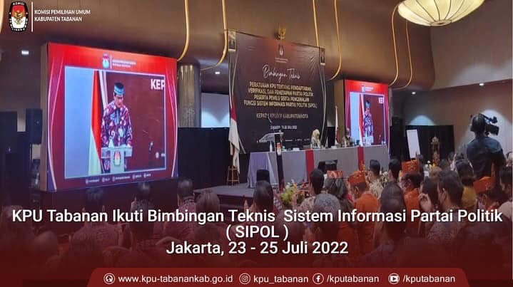 Sebagaimana dilansir dari media sosial KPU Tabanan (Facebook) yang diunggah pada (25/07/2022), “Menyamakan persepsi dan memberikan pemahaman regulasi dan kebijakan tentang pendaftaran, verifikasi, dan penetapan partai politik peserta Pemilu serta pengenalan fungsi Sistem Informasi Partai Politik ( SIPOL ), KPU mengadakan kegiatan Bimtek tentang hal dimaksud, berlangsung di Jakarta, 22 s.d 25 Juli 2022.