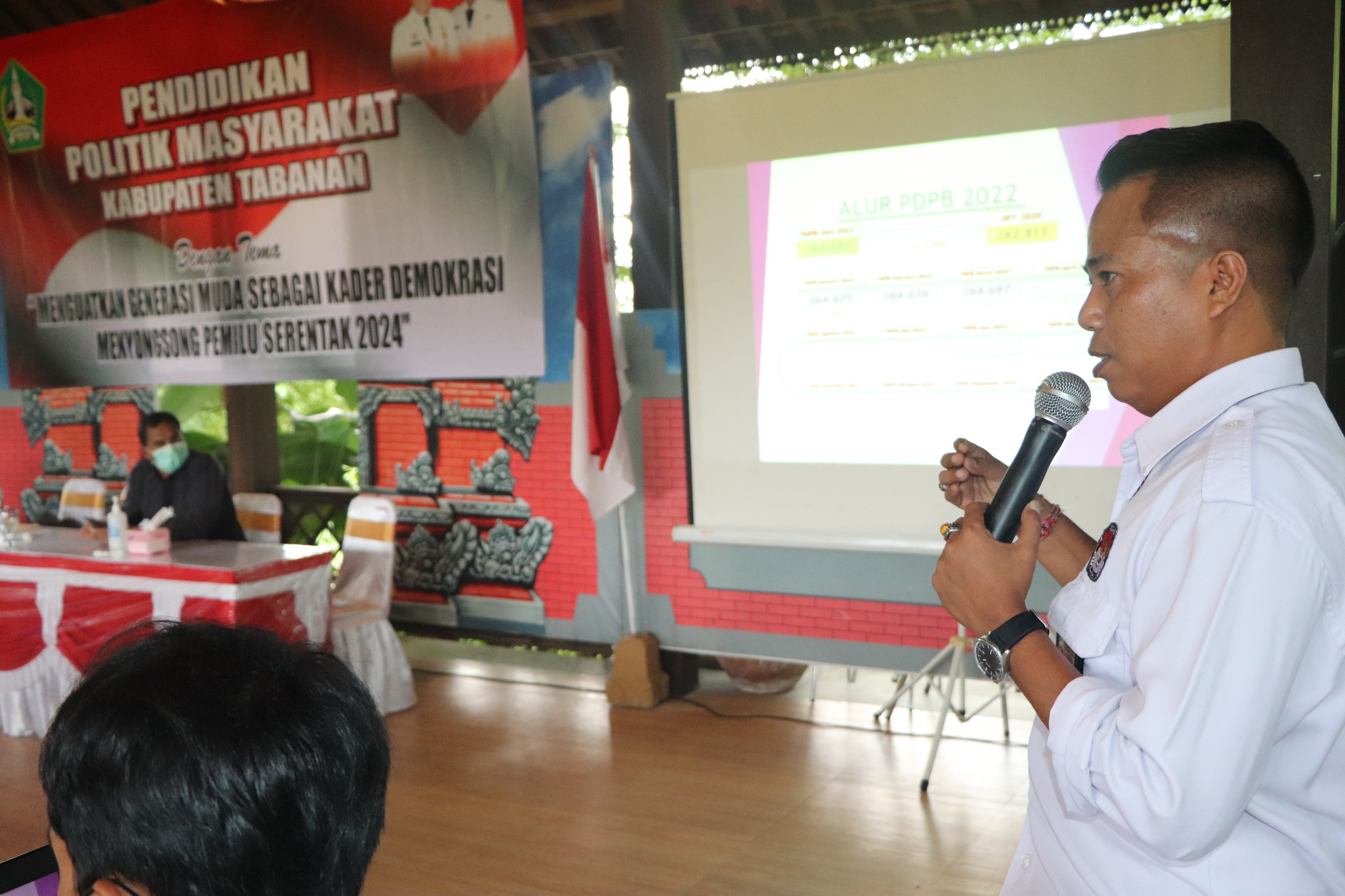 Berkaitan dengan itu Ketua KPU Kabupaten Tabanan, I Gede Putu Weda Subawa menghadiri acara yang diadakan Badan Kesbangpol Tabanan sebagai Narasumber dalam kegiatan pendidikan politik Masyarakat Kabupaten Tabanan dengan tema “Menguatkan Generasi Muda Sebagai Kader Demokrasi Menyongsong Pemilu Serentak 2024,” bertempat di Aula Warung CS Bedha Tabanan, Selasa (19/04/2022).