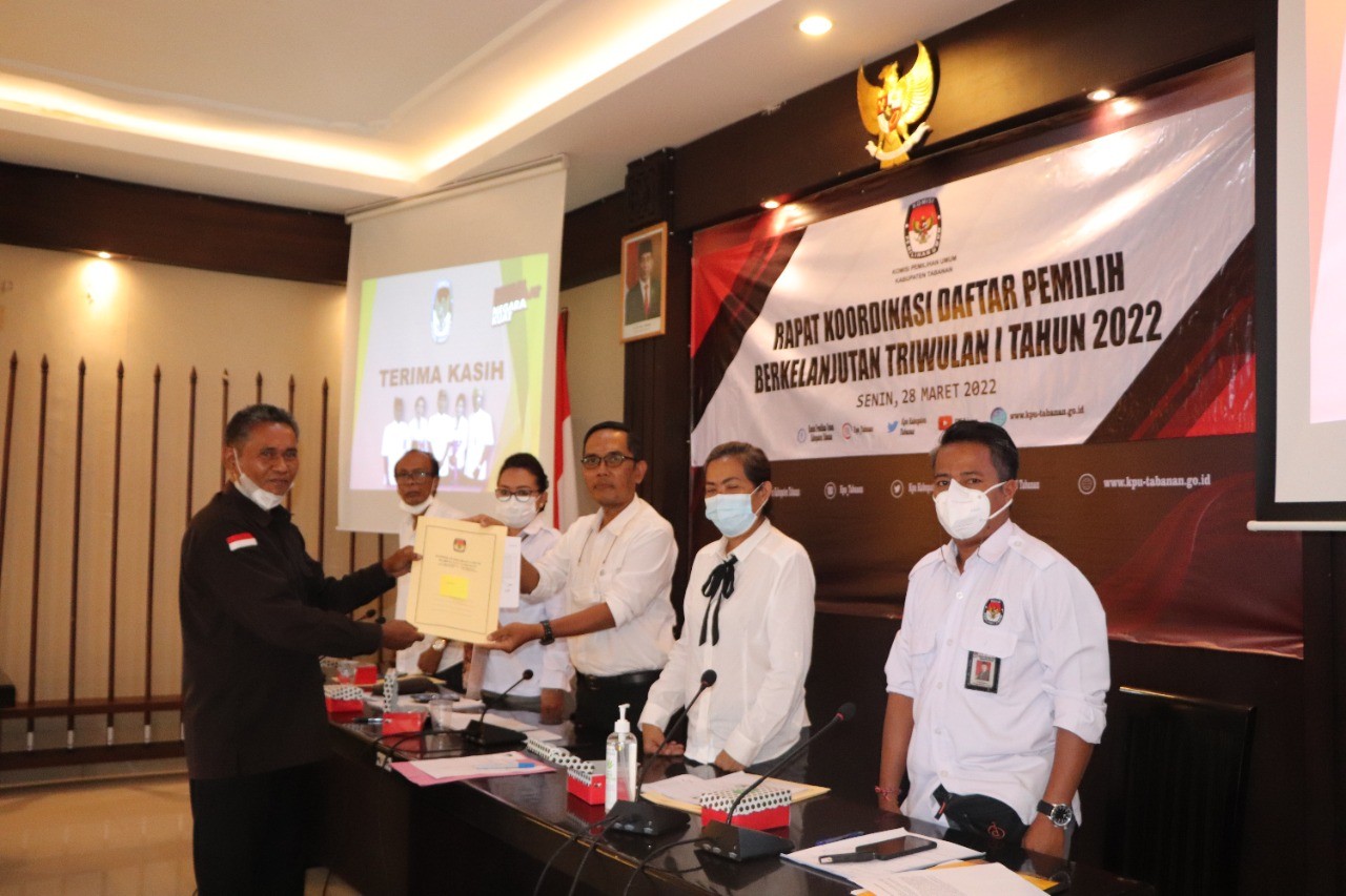 KPU Tabanan, Dangin Carik – Dalam rangka Pemutakhiran Data Pemilih Berkelanjutan (PDPB) tahun 2022, Komisi Pemilihan Umum (KPU) Kabupaten Tabanan mengundang Pemangku Kepentingan (Stakeholder) untuk menghadiri Rapat Koordinasi (Rakor) Daftar Pemilih Berkelanjutan Triwulan I tahun 2022, pukul 09.30 Wita, bertempat di Ruang Rapat Kantor KPU Tabanan, Senin (28/03/2022). Para Stakeholder yang hadir antara lain Polres, Kodim 1619, Dinas Kependudukan dan Pencatatan Sipil, Dinas Pemberdayaan Masyarakat Desa, Bawaslu serta Pengurus ataupun perwakilan Partai Politik (Parpol) yang ada di Kabupaten Tabanan. Sedangkan dari pihak KPU Tabanan hadir Ketua KPU Tabanan, I Gede Putu Weda Subawa dan seluruh Anggota KPU Tabanan. Acara dibuka oleh Ketua KPU Tabanan dan sebagai pemateri Anggota KPU Tabanan Ketua Divisi Perencanaan, Data dan Informasi, I Ketut Sugina. “Pemilih juga dikategorikan berdasarkan usia, Kami mencoba mengkategorikan sehingga teman-teman Parpol gampang dalam strategi politiknya. Bulan Maret ini jumlah Pemilih 364.697, sampai saat ini masih ada Pemilih Kita yang hanya tercatat dalam Suket saja. Kami berharap kawan-kawan Disdukcapil untuk menindaklanjutinya terkait Suket ini. Kami mendapatkan masukan dari Bawaslu bahwa Bawaslu telah melakukan uji faktual, langsung datang ke rumah-rumah Pemilih untuk mengecek data Kami,” jelas Sugina. “Kami sangat mengharapkan saran dari para Stakeholder.” pungkas sugina. “Kita bersyukur karena Bawaslu telah melakukan pengecekan ke bawah, harapan Kita dengan adanya kerjasama itu dan pengawasan yang dilakukan oleh bawaslu semoga Kita dapat berbenah ke arah yang lebih baik sehingga akan ada data akurat,” kata Pak Weda. Selanjutnya, “Atas peran serta dari Disdukcapil Kami ucapkan terima kasih dan Kami mendukung serta mengawal kegiatan yang dilakukan KPU Tabanan,” ucap I Nyoman Sumantara yang merupakan salah satu Kasat. pada Polres Tabanan. Begitu pula yang disampaikan dari Kodim 1619 Tabanan bahwa pada prinsipnya pihak Kodim 1619 Tabanan mendukung kegiatan KPU Tabanan. “Semoga Data Pemilih Berkelanjutan kedepannya dapat berjalan baik. Dari hari ke hari perubahan penduduk ini, baik itu domisili dan lainnya itu Kami temukan di lapangan. Respon Masyarakat juga kurang untuk membuat Akta Kematian,” KPU dan Bawaslu sesuai Peraturan Perundang-undangan mempunyai tugas untuk mewujudkan data yang mutakhir dan komprehensif,” ungkap Anggota Bawaslu Tabanan, I Ketut Narta. Ditambahkannya bahwa beberapa waktu lalu Bawaslu kabupaten Tabanan telah melakukan uji petik, “Inilah semangat Kami bagaimana data Pemilih itu dapat mutarlih dan kompttehensif,” imbuhnya. Sedangkan I Gusti Made Merta Putra (perwakilan DPMD Tabanan) mengatakan, “pada intinya setiap pertemuan di Desa khususnya Kami telah sampaikan kepada Perbekel dan Kawil agar secara intensif melaksanakan pemutakhitan data Pemilih, intinya Kami juga mendukung kegiatan KPU Tabanan.” “Saat ini Kami sudah tidak menerbitkan Suket lagi, peralatan Kita di Capil sudah semua tua. Satu satunya jalan Kami optimalkan peralatan yang ada, mohon nanti Kami agar yang telah meninggal disampaikan kepada Kami untuk diproses dan sekalian Kami terbitkan KK baru. Bantulah Kami untuk menginformasikan kepada Masyarakat, pelayanan Kami di Capil gratis alias tidak ada pembayaran,” ungkap I Wayan Januada (Disdukcapil). I Made Ardjana yang merupakan Pengurus di Parpol Golkar juga mengungkapkan, “Saya harapkan komitmen dan integritas KPU tetap terjaga dan juga hubungan antara KPU, Bawaslu dan Stakeholder lainnya termasuk di dalamnya Parpol dapat berjalan baik.” “Mari Kita tetap lakukan tugas dan tetap berjuang dan berdoa,” tambahnya. “Kami apresiasi teman-teman di KPU dan Bawaslu serta Stakeholder lainnya bahwa setiap rapat sudah ada perubahan. Sehingga terjadi komunikasi dan koordinasi yang semakin bagus,” ucap I Gusti Nyoman Omardani dari Perwakilan PDI Perjuangan. Pada intinya KPU Kabupaten Tabanan telah menetapkan jumlah Pemilih di Kabupaten Tabanan pada Maret 2022 sebanyak 364.697 Pemilih, yang terdiri dari Pemilih Laki-Laki sebanyak 179.187 dan Perempuan sebanyak 185.510 Pemilih. Jumlah tersebut bertambah sebanyak 21 Pemilih jika dibandingkan dengan jumlah Pemilih pada bulan Februari 2022 yang sebanyak 364.676 Pemilih. Ketua KPU Tabanan, I Gede Putu Weda Subawa didampingi Ketua Divisi Perencanaan, Data dan Informasi KPU Tabanan, I Ketut Sugina menyampaikan bahwa dalam proses pemutakhiran data Pemilih berkelanjutan bulan Maret ini, pihaknya memasukkan Pemilih baru sebanyak 40 Pemilih, kemudian mencoret Pemilih TMS (Tidak Memenuhi Syarat) sebanyak 19 Pemilih serta melakukan ubah elemen data Pemilih sebanyak 3 orang. “Berdasarkan masukan dari Masyarakat yakni Desa-Desa yang ada, pada bulan ini Kita menambahkan Pemilih pemula sebanyak 40 Orang dan Kita juga mencoret 19 Pemilih yang TMS karena meninggal, sehingga jumlah Pemilih Kita saat ini menjadi 364.976 Pemilih, sedangkan untuk ubah elemen data tidak mempengaruhi jumlah Pemilih,” ucapnya. Jika dibandingkan dengan jumlah Pemilih pada bulan Februari maka terjadi penambahan 21 Pemilih akibat dimasukannya 40 Pemilih baru dan dicoretnya 19 Pemilih yang TMS. Dijelaskan lebih jauh proses PDPB yang dilakukan KPU Tabanan setiap bulannya ada tiga prinsip utama yang dilakukan yakni menambah Pemilih baru yang memenuhi syarat, kemudian mencoret Pemilih yang tidak memenuhi syarat serta melakukan ubah elemen data jika ada data yang tidak sesuai atau keliru. Kegiatan yang dilaksanakan dalam situasi Virus Corona atau Covid-19 dengan tetap memperhatikan protokol kesehatan seperti menjaga jarak fisik atau physical distancing, menggunakan masker, menggunakan cairan pembersih tangan atau hand zanitizer serta mencuci tangan dengan sabun dan air mengalir. (Humas KPU Tabanan).