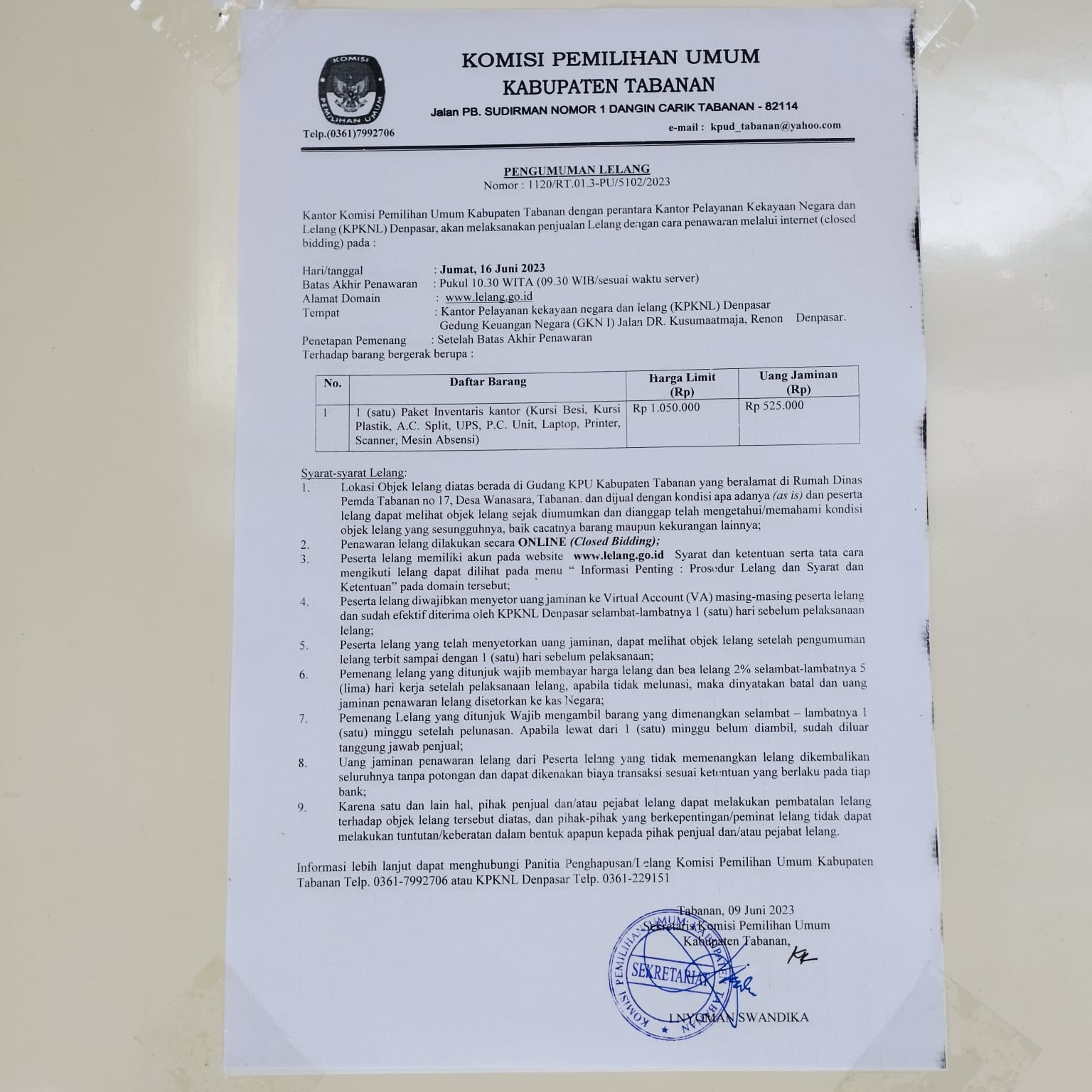 Komisi Pemilihan Umum (KPU) Kabupaten Tabanan dengan perantara Kantor Pelayanan Kekayaan Negara dan Lelang (KPKNL) Denpasar akan melaksanakan penjualan lelang dengan cara penawaran melalui internet pada hari Jumat tanggal 16 Juni 2023. Untuk lebih jelasnya terkait lelang dimaksud silahkan lihat disini..