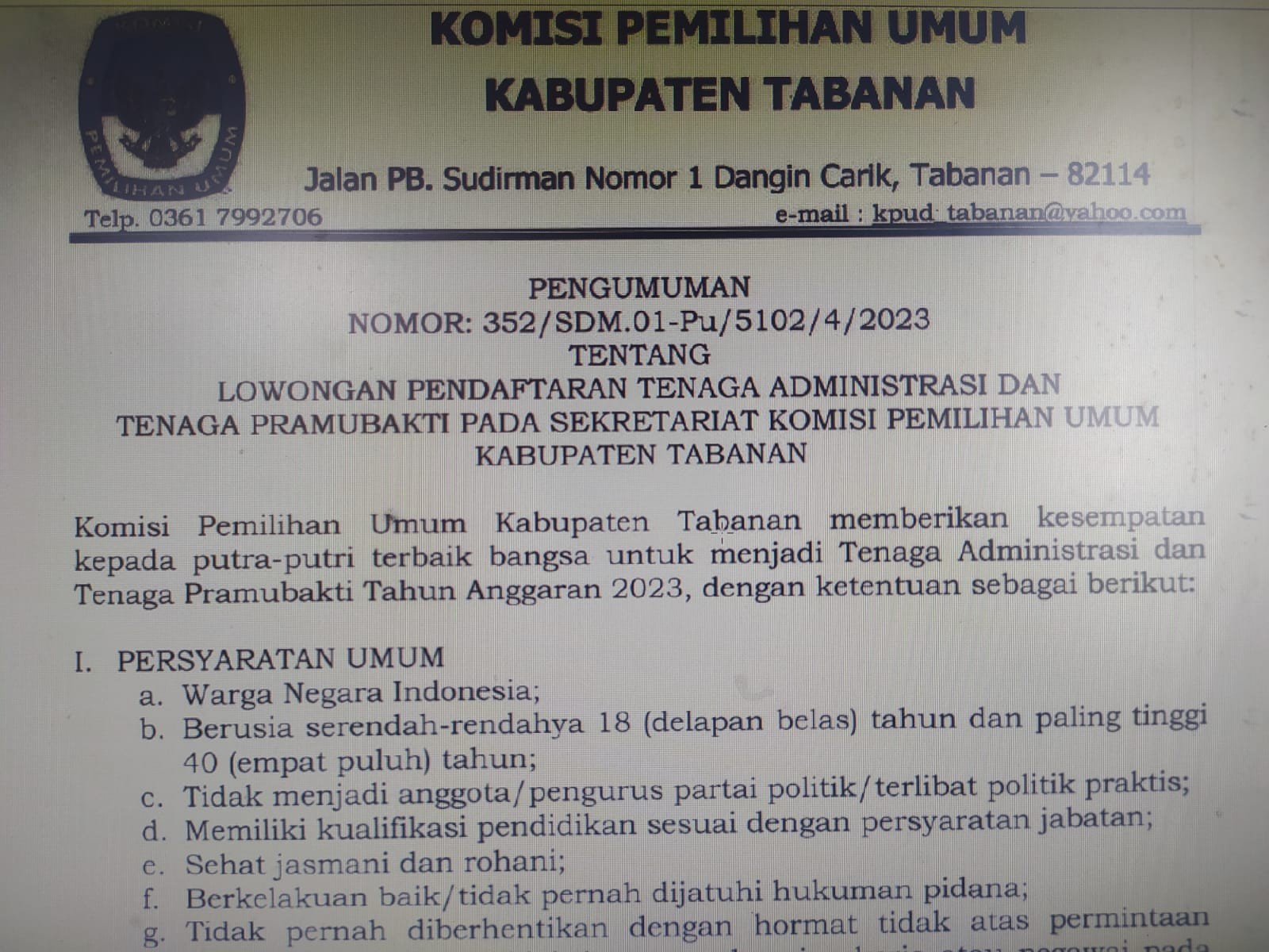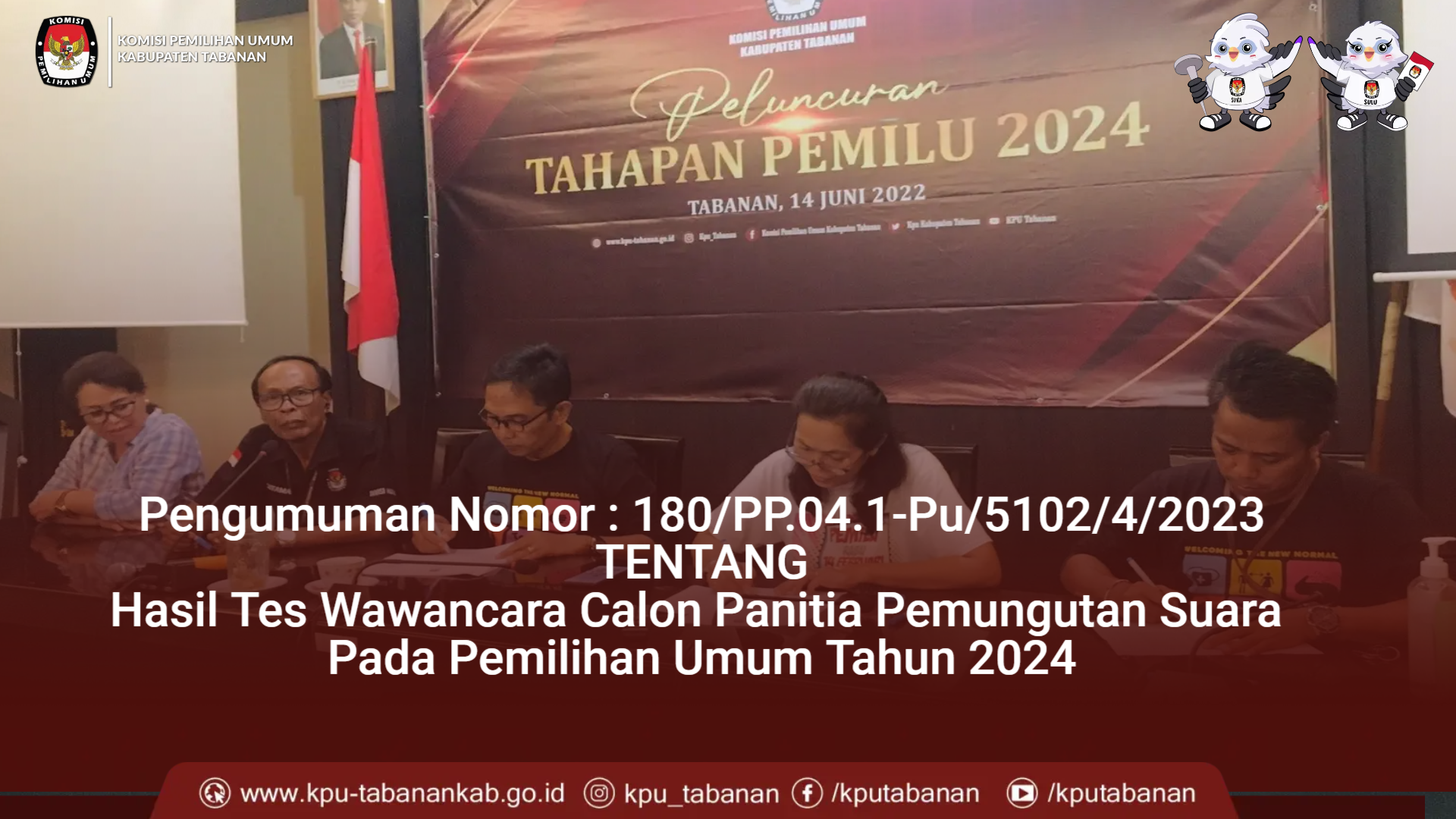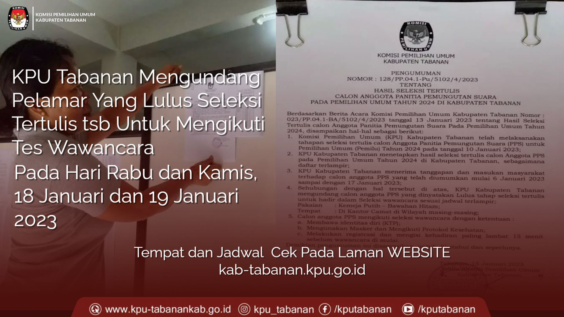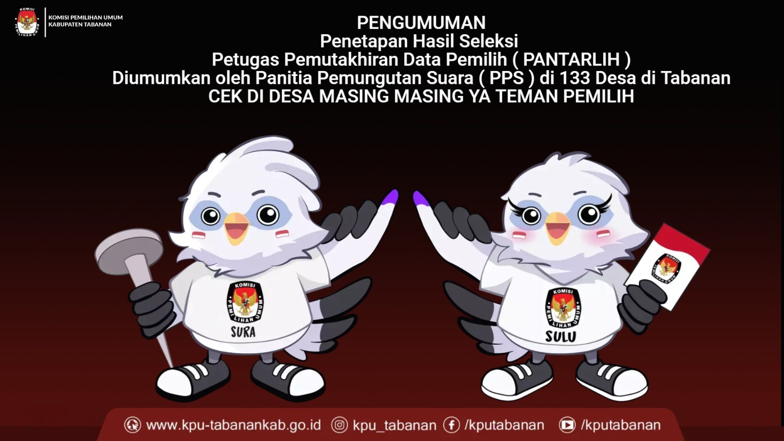 Panitia Pemungutan Suara (PPS) pada 133 Desa yang ada di Kabupaten Tabanan hari ini, Jumat (03/02/2023) telah mengumumkan Hasil Seleksi Petugas Pemutakhiran Data Pemilih (Pantarlih) untuk Pemilu Serentak tahun 2024. Sehubungan dengan itu PPS di masing-masing Desa mengharapkan kehadiran Calon Pantarlih yang terpilih untuk hadir dalam pelantikan yakni pada hari Senin, 6 Februari 2023. Untuk tempatnya disesuaikan di wilayah masing-masing, lebih jelasnya silahkan menghubungi PPS di wilayah masing - masing atau bisa di lihat pada link di bawah ini : Kecamatan Pupuan : Desa Pujungan Desa Munduktemu Desa Karyasari Desa Sai Desa Sanda Desa Pajahan Desa Jelijih Punggang Desa Bantiran Desa Padangan Desa Pupuan Desa Belimbing Desa Belatungan Desa Batungsel Desa Kebon Padangan Kecamatan Selemadeg Barat : Desa Tiyinggading Desa Selabih Desa Mundeh Desa Mundeh Kauh Mundeh Kangin Lumbung Lumbung Kauh Lalanglinggah Bengkel Sari Antosari Angkah Kecamatan Selemadeg : Wanagiri Wanagiri Kauh Serampingan Desa Pupuan Sawah Desa Manikyang Desa Berembeng Desa Bajera Desa Bajera Utara Desa Antap Desa Selemadeg Kecamatan Selemadeg Timur : Desa Beraban Desa Gadungan Desa Bantas Desa Gunung Salak Desa Tegal Mengkeb Desa Gadung Sari Desa Megati Desa Tangguntiti Desa Dalang Desa Mambang Kecamatan Kerambitan : Desa Kesiut Desa Tibubiu Desa Tista Desa Timpag Sembung Gede Desa Samsam Desa Penarukan Desa Pangkung Karung Desa Meliling Desa Kukuh Desa Kerambitan Desa Kelating Desa Belumbang Desa Baturiti Desa Batuaji Kecamatan Tabanan : Desa Wanasari Desa Tunjuk Desa Sudimara Desa Subamia Desa Sesandan Desa Gubug Desa Denbantas Desa Delod Peken Desa Dauh Peken Desa Dajan Peken Desa Buahan Desa Bongan Kecamatan Kediri : Desa Pejaten Desa Pangkung Tibah Desa Pandak Gede Desa Pandak Bandung Desa Nyitdah Desa Nyambu Desa Kediri Desa Kaba - Kaba Desa Cepaka Desa Buwit Desa Beraban Desa Bengkel Desa Belalang Desa Banjar Anyar Desa Abiantuwung Kecamatan Marga : Desa Baru Desa Beringkit Belayu Desa Geluntung Desa Kukuh Desa Kuwum Desa Marga Dajan Puri Desa Marga Dauh Puri Desa Marga Desa Tua Desa Cau Belayu Desa Tegaljadi Desa Payangan Desa Peken Belayu Desa Batannyuh Desa Petiga Desa Selanbawak Kecamatan Baturiti : Desa Perean Kangin Desa Bangli Desa Baturiti Desa Perean Desa Mekarsari Desa Apuan Desa Perean Tengah Desa Candikuning Desa Luwus