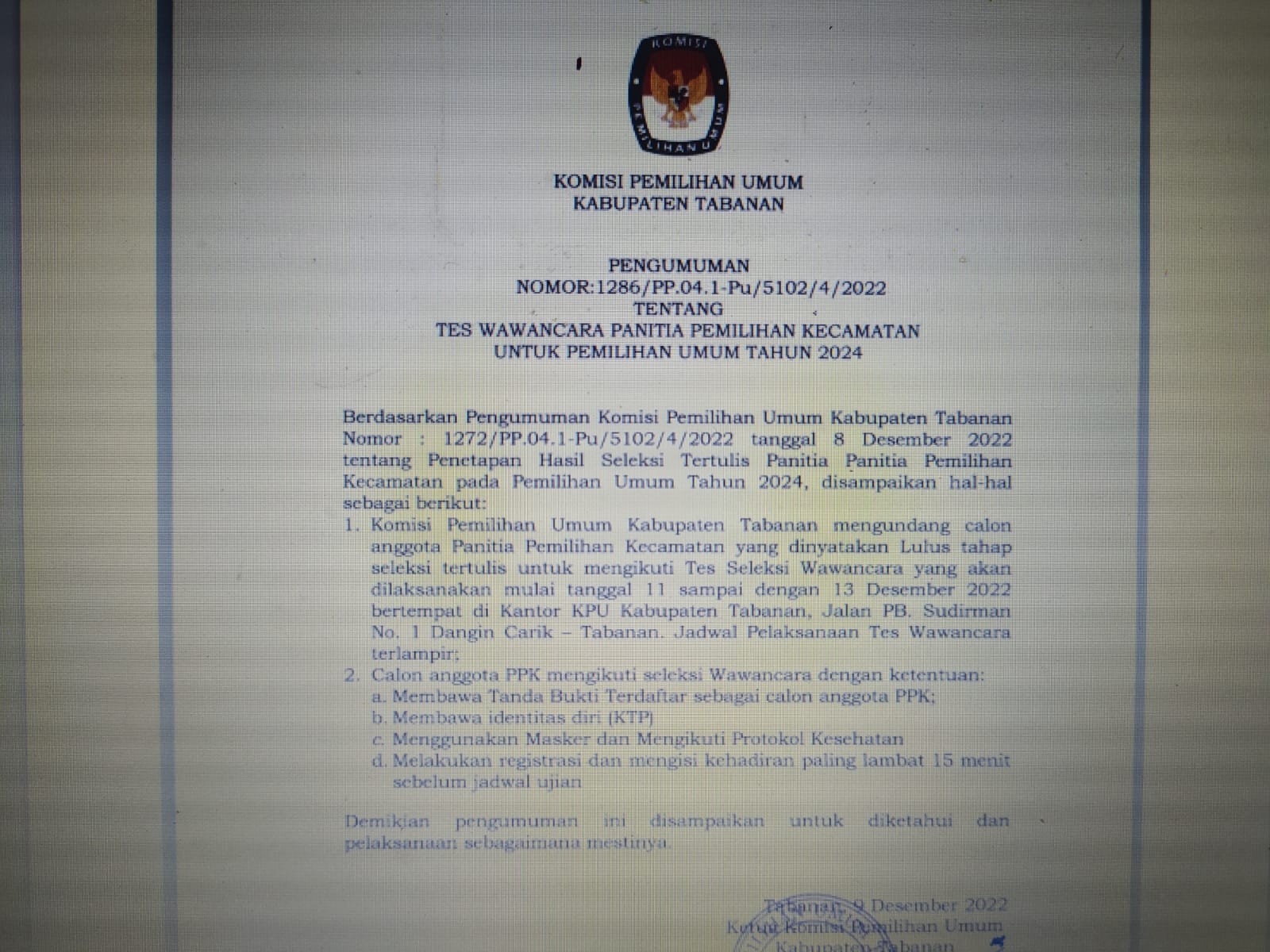 Komisi Pemilihan Umum Kabupaten Tabanan Mengumumkan Hasil Seleksi Tertulis Calon Anggota Panitia Pemilihan Kecamatan ( PPK ) untuk Pemilu Tahun 2024, hari ini Kamis, 8 Desember 2024, Pengumuman telah ditempel di papan pengumuman Kantor KPU Tabanan, atau silakan Download disini.