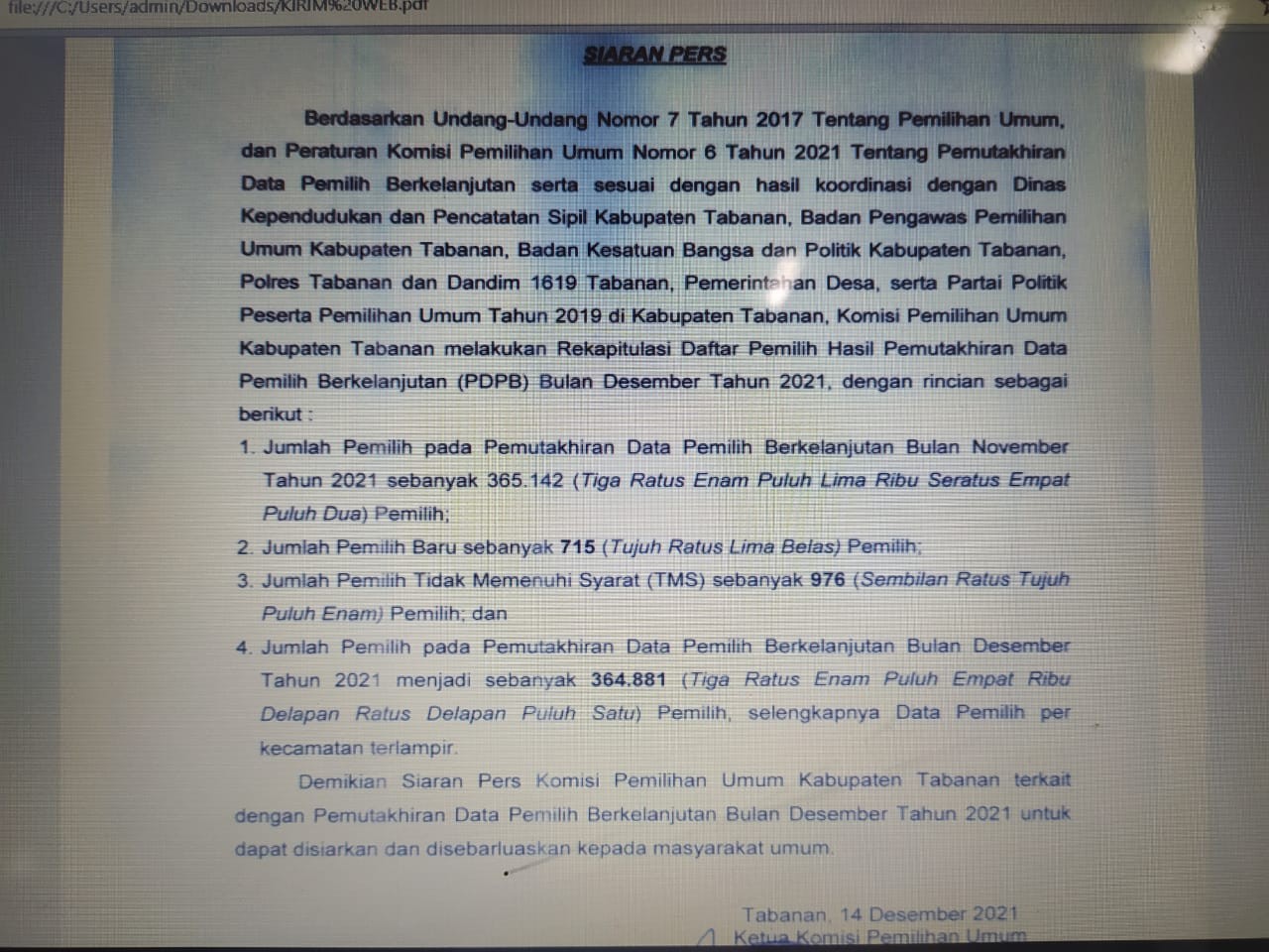 Berikut disampaikan Rekapitulasi Daftar Pemilih Hasil Pemutakhiran Data Pemilih Berkelanjutan (PDPB) bulan Desember tahun 2021 di Kabupaten Tabanan