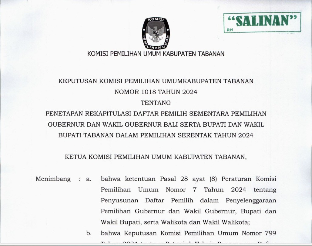 KPU Tabanan. Sabtu, 24 Agustus 2024 - Komisi Pemilihan Umum Kabupaten Tabanan mengeluarkan SK Nmor 1053 Tahun 2024 Tentang Penetapan Syarat Minimal Perolehan Suara Partai Politik dan atau Gabungan Partai Politik untuk Pemilihan Bupati dan Wakil Bupati Tabanan.