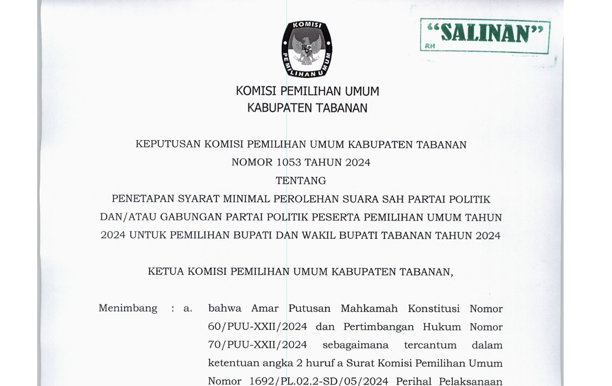 https://kab-tabanan.kpu.go.id/public/kab-tabanan/dmdocument/1724493487SALINAN SK NO. 1053 TAHUN 2024 TTG PENETAPAN SYARAT MINIMAL PEROLEHAN SUARA PARPOL DAN ATAU GABUNGAN U. PILKADA TH. 2024.pdf