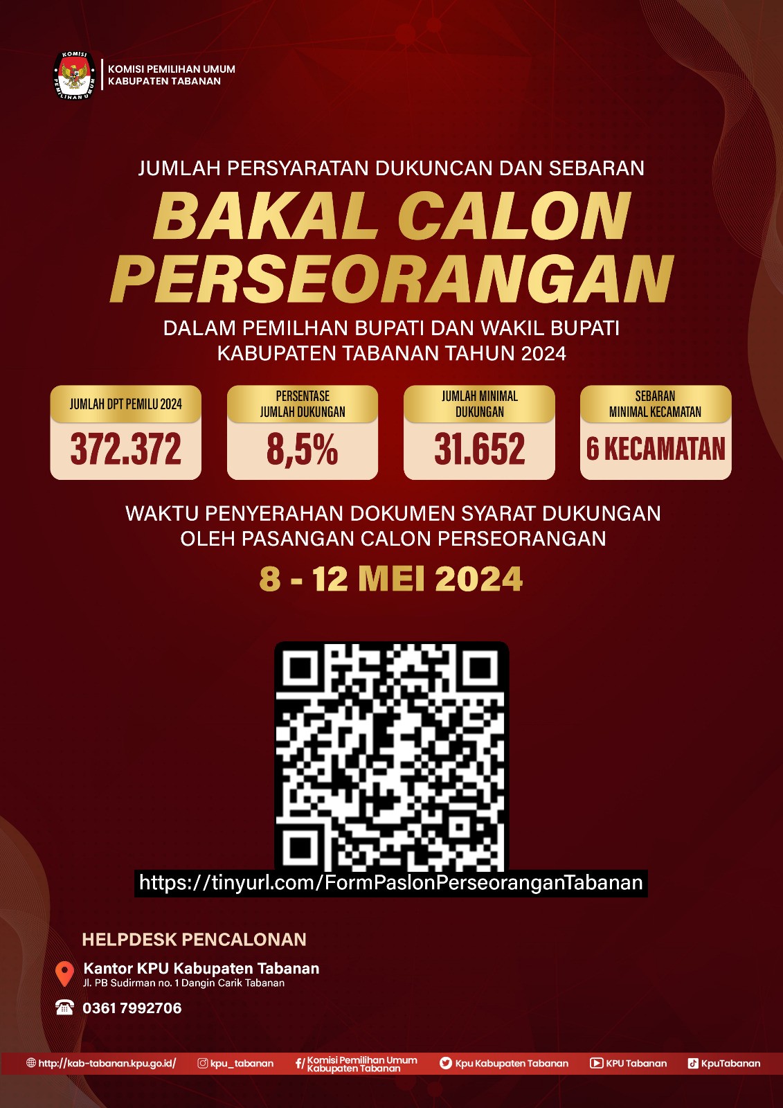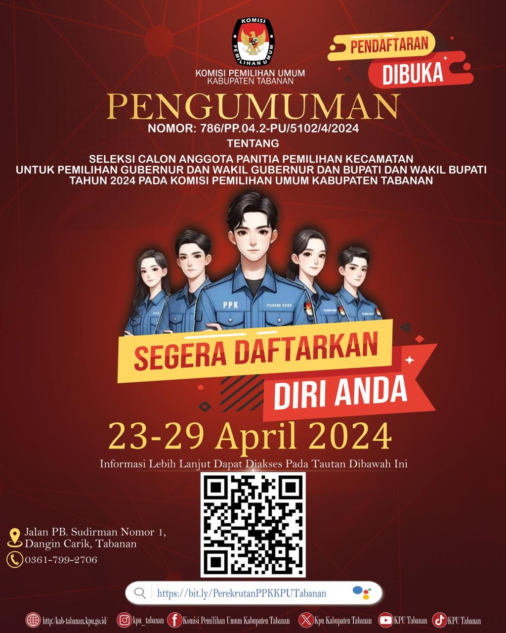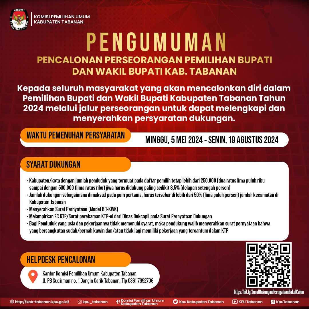 https://kab-tabanan.kpu.go.id/public/kab-tabanan/dmdocument/1713835549PENGUMUMAN NO. 786_PP.04.2-PU_5102_4_2024 TTG SELEKSI CALON ANGGOTA PPK UNTUK PEMILIHAN GUBERNUR DAN WAKIL GUBERNUR DAN BUPATI DAN WAKIL BUPATI TH. 2024 PD KPU KAB. TABANAN.pdf