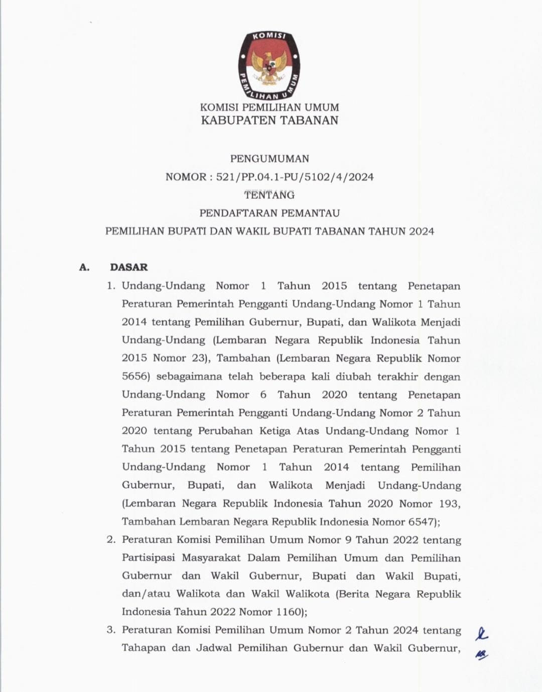 https://kab-tabanan.kpu.go.id/public/kab-tabanan/dmdocument/1709694566PENGUMUMAN NO. 521_PP.04.1_PU_5102_4_2-2024 TTG PENDAFTYARAN PEMANTAU PIMILIHAN BUPATI DAN WAKIL BUPATI TABANAN TH. 2024 (1).pdf