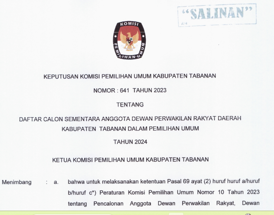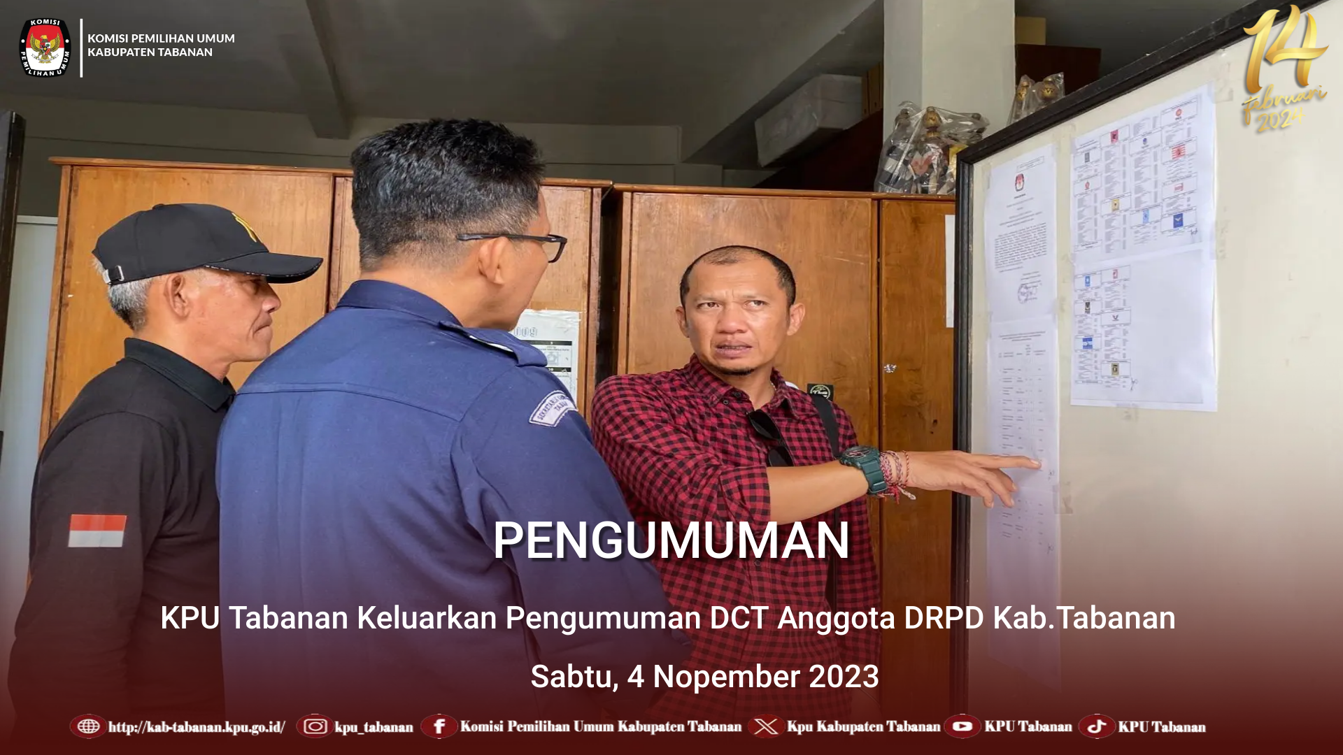 KPU Tabanan umumkan secara resmi Daftar Calon Tetap ( DCT ) Anggota DPRD Kabupaten Tabanan untuk Pemilu Tahun 2024 pada Sabtu, 4 Nopember 2023 setelah sebelumnya dilakukan tahapan pencermatan DCT dan Finalisasi DCT yang tentu saja melibatkan Partai Politik serta pengawasan dari Badan Pengawas Pemilu Kabupaten Tabanan ( BAWASLU ), Jumat 3 Nopember 2023 KPU Tabanan telah menetapkan DCT Anggota DPRD Kabupaten Tabanan dalam Rapat Pleno yang digelar di ruang rapat kantor KPU Tabanan, Jln Sudirman No 1 Dangin Carik Tabanan Bali. Pengumuman tersebut telah diumumkan melalui media cetak ( Nusa Bali, Media Elektronik ( Radio Thomson ) , di Media Sosial Resmi KPU Tabanan serta ditempelkan di papan pengumuman KPU Tabanan, Berikut link Pengumuman yang dapat diakses oleh publik. https://kab-tabanan.kpu.go.id/public/kab-tabanan/dmdocument/16990853223.2. LAMP. PENGUMUMAN DCT.pdf https://kab-tabanan.kpu.go.id/public/kab-tabanan/dmdocument/16990852533.1. PENGUMUMAN DCT.pdf https://kab-tabanan.kpu.go.id/public/kab-tabanan/dmdocument/1699085667KEPUTUSAN DCT_compressed.pdf