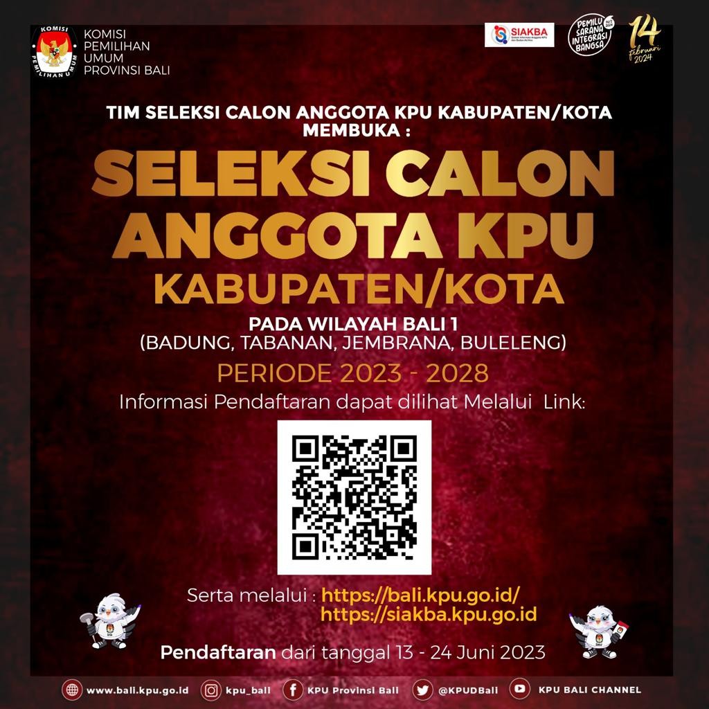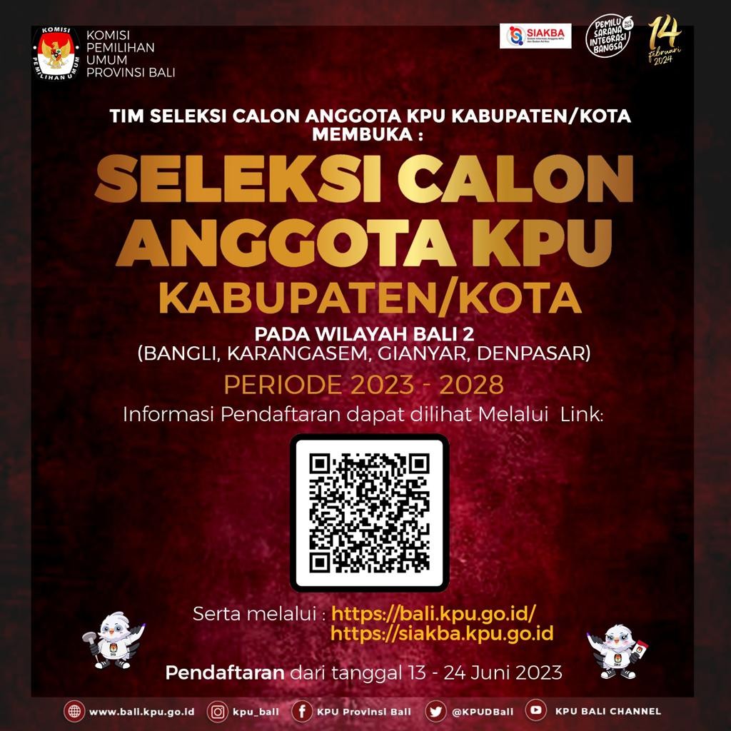 Tim Seleksi Calon Anggota KPU Kabupaten/Kota Periode 2023 - 2028 untuk Bali 2 (dua) meliputi Kabupaten Bangli, Karangasem, Gianyar dan Denpasar, Dengan ini mengundang Warga Negara Indonesia yang memenuhi persyaratan untuk mendaftarkan diri menjadi Calon Anggota KPU Kabupaten/Kota periode 2023 - 2028, Pendaftaran dimulai dari tanggal 13 Juni – 24 Juni tahun 2023.